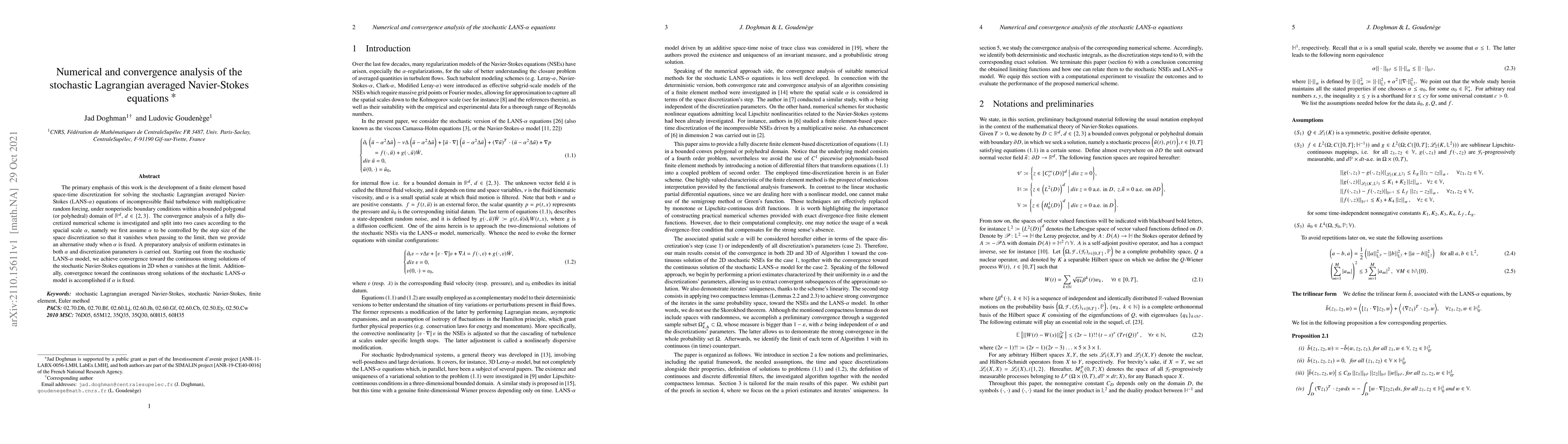 The primary emphasis of this work is the development of a finite element based space-time discretization for solving the stochastic Lagrangian averaged Navier-Stokes (LANS-$\alpha$) equations of incompressible fluid turbulence with multiplicative random forcing, under nonperiodic boundary conditions within a bounded polygonal (or polyhedral) domain of R^d , d $\in$ {2, 3}. The convergence analysis of a fully discretized numerical scheme is investigated and split into two cases according to the spacial scale $\alpha$, namely we first assume $\alpha$ to be controlled by the step size of the space discretization so that it vanishes when passing to the limit, then we provide an alternative study when $\alpha$ is fixed. A preparatory analysis of uniform estimates in both $\alpha$ and discretization parameters is carried out. Starting out from the stochastic LANS-$\alpha$ model, we achieve convergence toward the continuous strong solutions of the stochastic Navier-Stokes equations in 2D when $\alpha$ vanishes at the limit. Additionally, convergence toward the continuous strong solutions of the stochastic LANS-$\alpha$ model is accomplished if $\alpha$ is fixed.
