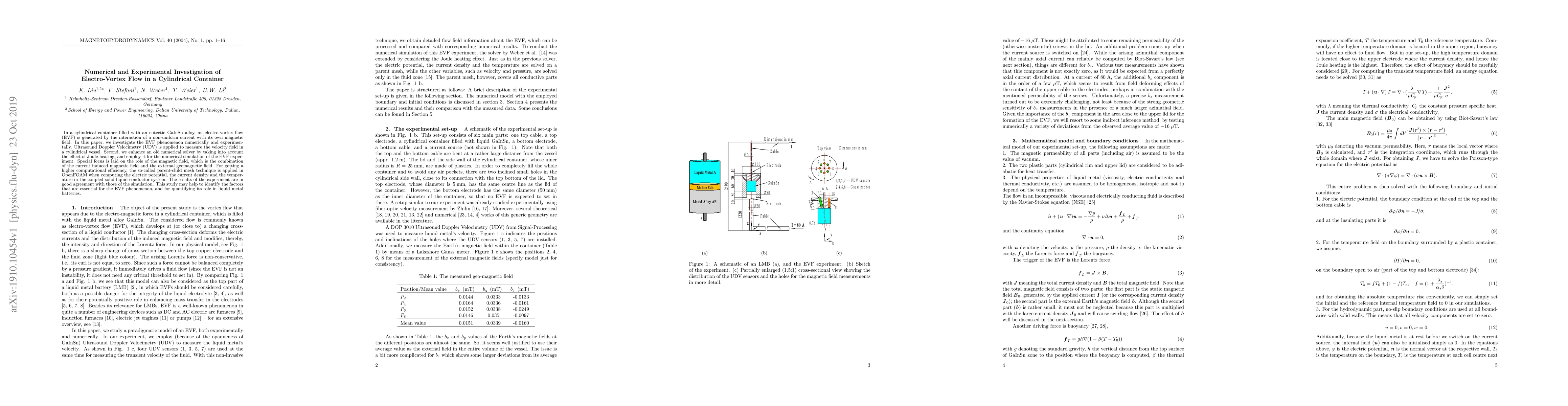 In a cylindrical container filled with an eutectic GaInSn alloy, an electro-vortex flow (EVF) is generated by the interaction of a non-uniform current with its own magnetic field. In this paper, we investigate the EVF phenomenon numerically and experimentally. Ultrasound Doppler Velocimetry (UDV) is applied to measure the velocity field in a cylindrical vessel. Second, we enhance an old numerical solver by taking into account the effect of Joule heating, and employ it for the numerical simulation of the EVF experiment. Special focus is laid on the role of the magnetic field, which is the combination of the current induced magnetic field and the external geomagnetic field. For getting a higher computational efficiency, the so-called parent-child mesh technique is applied in OpenFOAM when computing the electric potential, the current density and the temperature in the coupled solid-liquid conductor system. The results of the experiment are in good agreement with those of the simulation. This study may help to identify the factors that are essential for the EVF phenomenon, and for quantifying its role in liquid metal batteries.