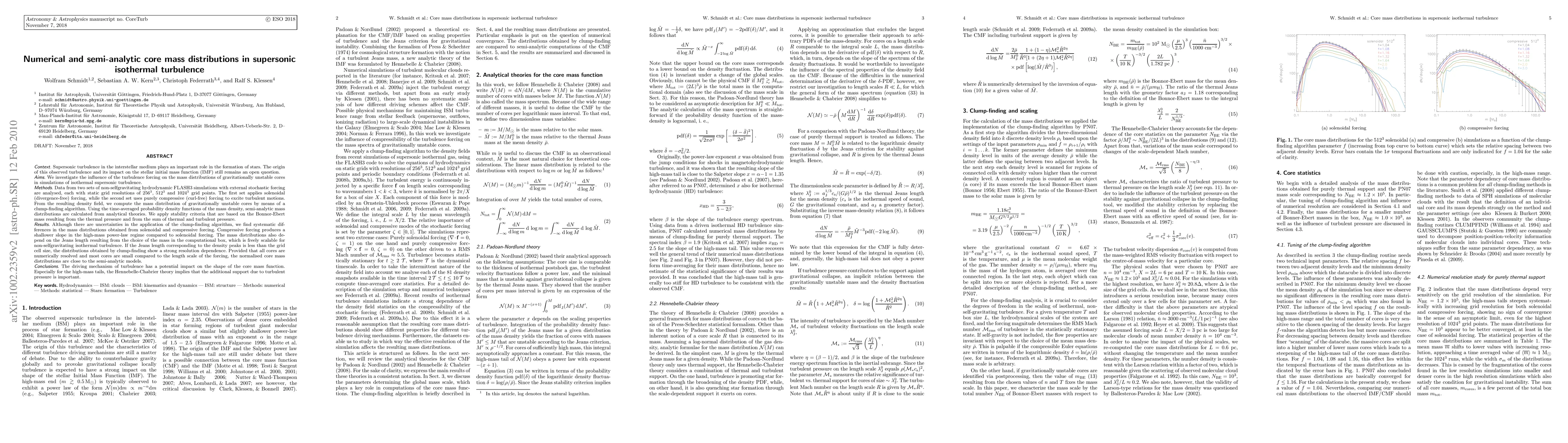 We investigate the influence of the turbulence forcing on the mass distributions of gravitationally unstable cores by postprocessing data from simulations of non-selfgravitating isothermal supersonic turbulence with varying resolution. In one set of simulations solenoidal forcing is applied, while the second set uses purely compressive forcing to excite turbulent motions. From the resulting density field, we compute the mass distribution of gravitationally unstable cores by means of a clump-finding algorithm. Using the time-averaged probability density functions of the mass density, semi-analytic mass distributions are calculated from analytical theories. We apply stability criteria that are based on the Bonnor-Ebert mass resulting from the thermal pressure and from the sum of thermal and turbulent pressure. Although there are uncertainties in the application of the clump-finding algorithm, we find systematic differences in the mass distributions obtained from solenoidal and compressive forcing. Compressive forcing produces a shallower slope in the high-mass power-law regime compared to solenoidal forcing. The mass distributions also depend on the Jeans length resulting from the choice of the mass in the computational box, which is freely scalable for non-selfgravitating isothermal turbulence. Provided that all cores are numerically resolved and most cores are small compared to the length scale of the forcing, the normalised core mass distributions are found to be close to the semi-analytic models. Especially for the high-mass tails, the Hennebelle-Chabrier theory implies that the additional support due to turbulent pressure is important.