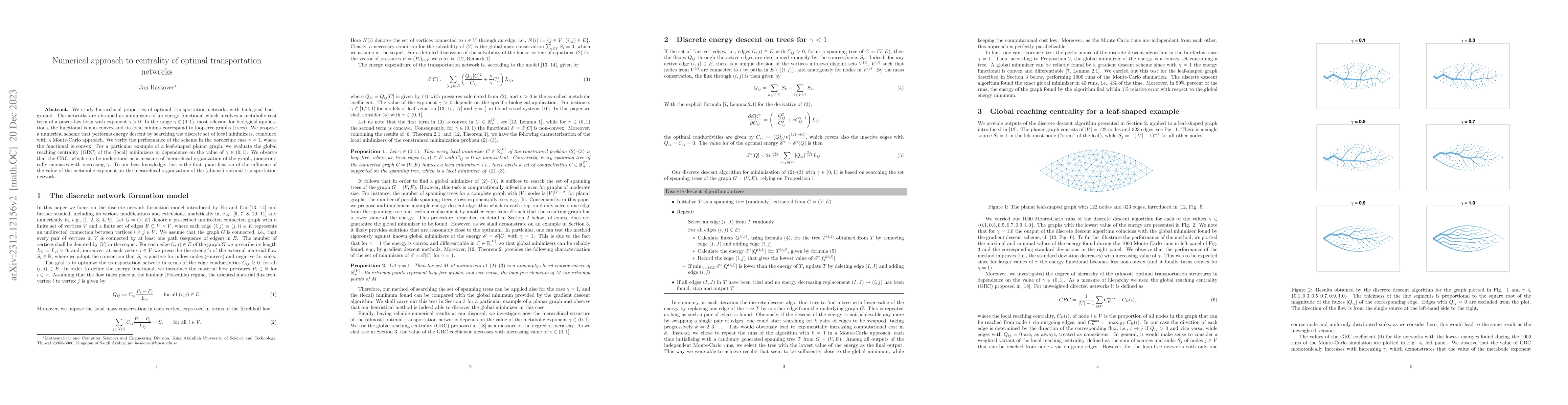 We study hierarchical properties of optimal transportation networks with biological background. The networks are obtained as minimizers of an energy functional which involves a metabolic cost term of a power-law form with exponent $\gamma>0$. In the range $\gamma\in (0,1)$, most relevant for biological applications, the functional is non-convex and its local minima correspond to loop-free graphs (trees). We propose a numerical scheme that performs energy descent by searching the discrete set of local minimizers, combined with a Monte-Carlo approach. We verify the performance of the scheme in the borderline case $\gamma=1$, where the functional is convex. For~a~particular example of a leaf-shaped planar graph, we evaluate the global reaching centrality (GRC) of the (local) minimizers in dependence on the value of $\gamma\in (0,1]$. We observe that the GRC, which can be understood as a measure of hierarchical organization of the graph, monotonically increases with increasing $\gamma$. To our best knowledge, this is the first quantification of the influence of the value of the metabolic exponent on the hierarchical organization of the (almost) optimal transportation network.