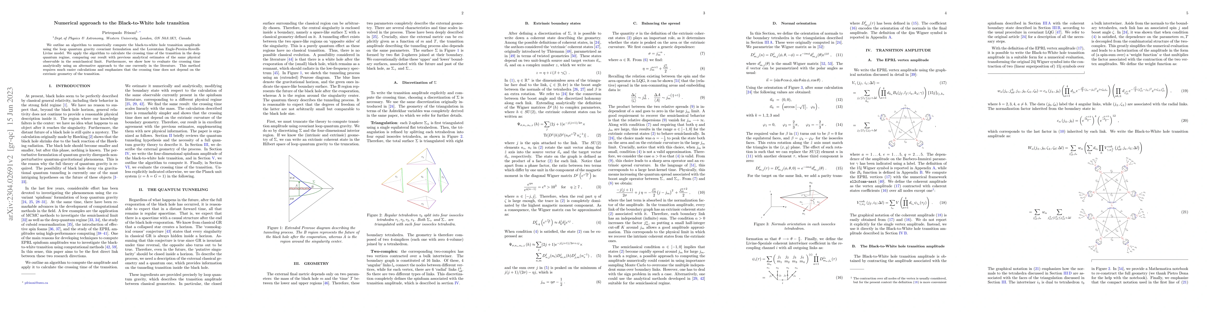 This paper presents a numerical algorithm to compute the black-to-white hole transition amplitude using loop quantum gravity, comparing its deep quantum regime results with semiclassical estimates. It also introduces an easier analytical method to evaluate the transition's crossing time, independent of the transition's extrinsic geometry.