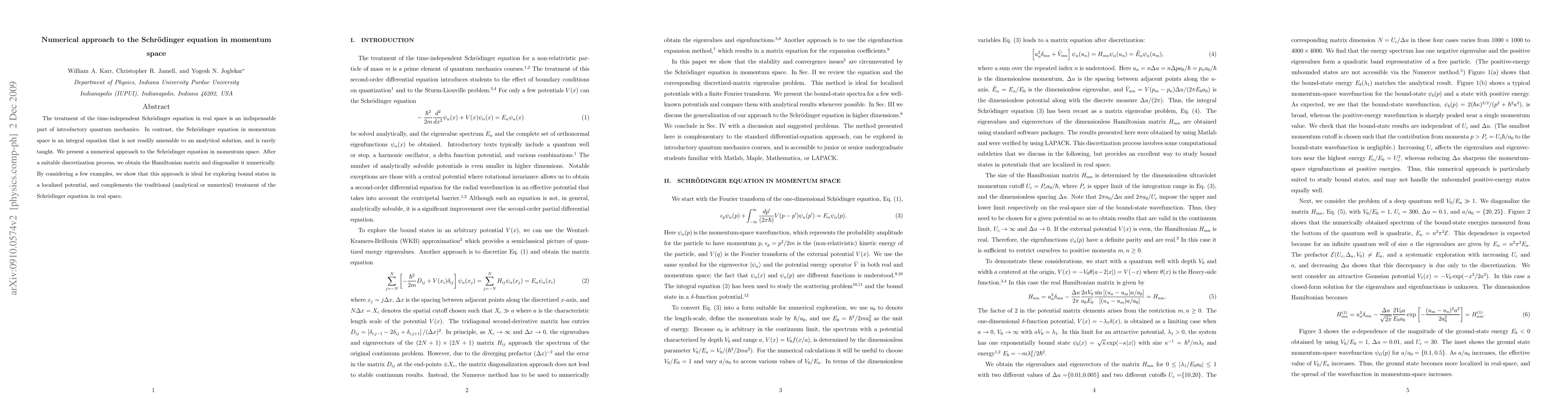 This paper presents a numerical method for solving the time-independent Schrödinger equation in momentum space, transforming it into a Hamiltonian matrix that is diagonalized to find bound-state solutions. This approach complements traditional real-space methods and is particularly useful for localized potentials.