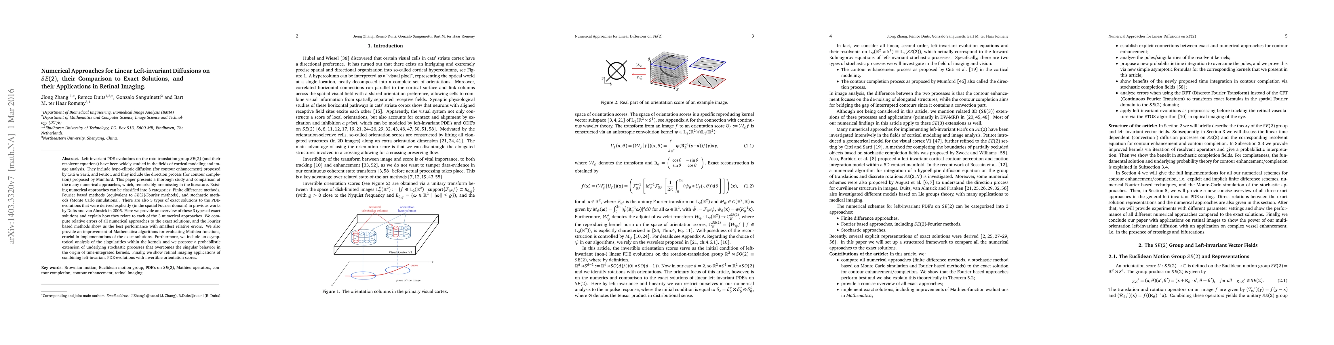 This paper compares various numerical methods for solving left-invariant PDE-evolutions on $SE(2)$, finding that Fourier based methods perform the best. It also introduces improvements to Mathematica algorithms for evaluating Mathieu functions and proposes a probabilistic extension to address singularities in stochastic processes, with applications in retinal imaging.