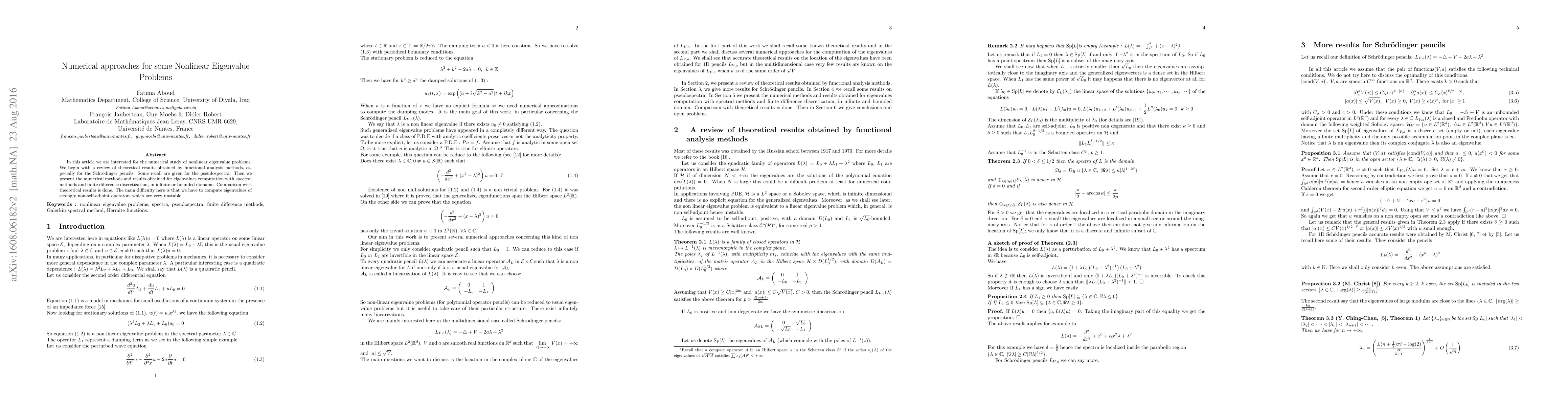 In this article we are interested for the numerical study of nonlinear eigenvalue problems. We begin with a review of theoretical results obtained by functional analysis methods, especially for the Schrodinger pencils. Some recall are given for the pseudospectra. Then we present the numerical methods and results obtained for eigenvalues computation with spectral methods and finite difference discretization, in infinite or bounded domains. Comparison with theoretical results is done. The main difficulty here is that we have to compute eigenvalues of strongly non-self-adjoint operators which are very unstable.