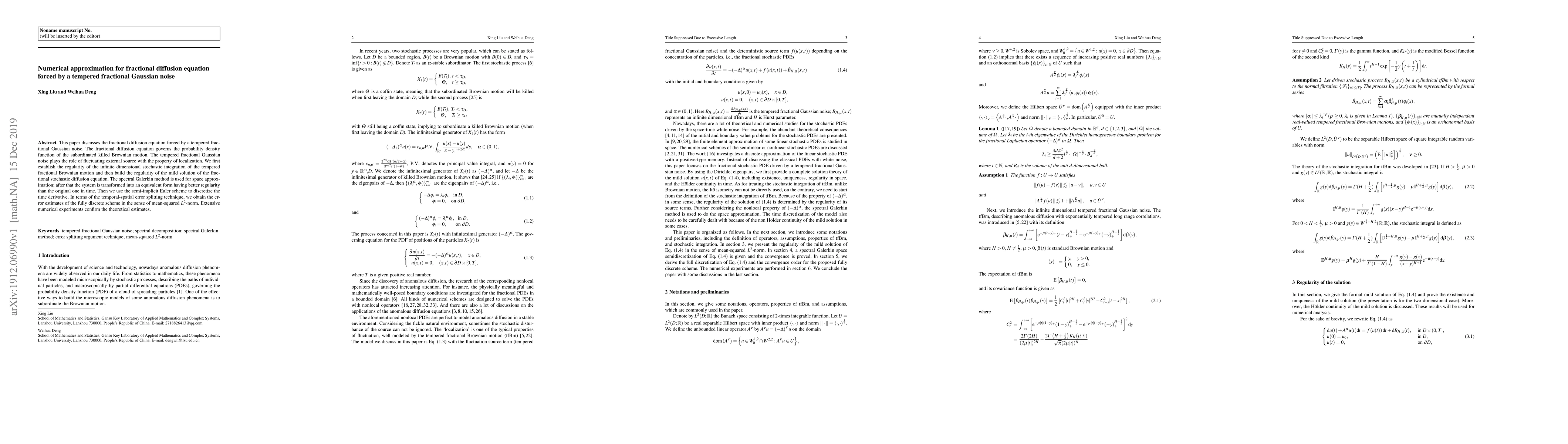 This paper discusses the fractional diffusion equation forced by a tempered fractional Gaussian noise. The fractional diffusion equation governs the probability density function of the subordinated killed Brownian motion. The tempered fractional Gaussian noise plays the role of fluctuating external source with the property of localization. We first establish the regularity of the infinite dimensional stochastic integration of the tempered fractional Brownian motion and then build the regularity of the mild solution of the fractional stochastic diffusion equation. The spectral Galerkin method is used for space approximation; after that the system is transformed into an equivalent form having better regularity than the original one in time. Then we use the semi-implicit Euler scheme to discretize the time derivative. In terms of the temporal-spatial error splitting technique, we obtain the error estimates of the fully discrete scheme in the sense of mean-squared $L^2$-norm. Extensive numerical experiments confirm the theoretical estimates.