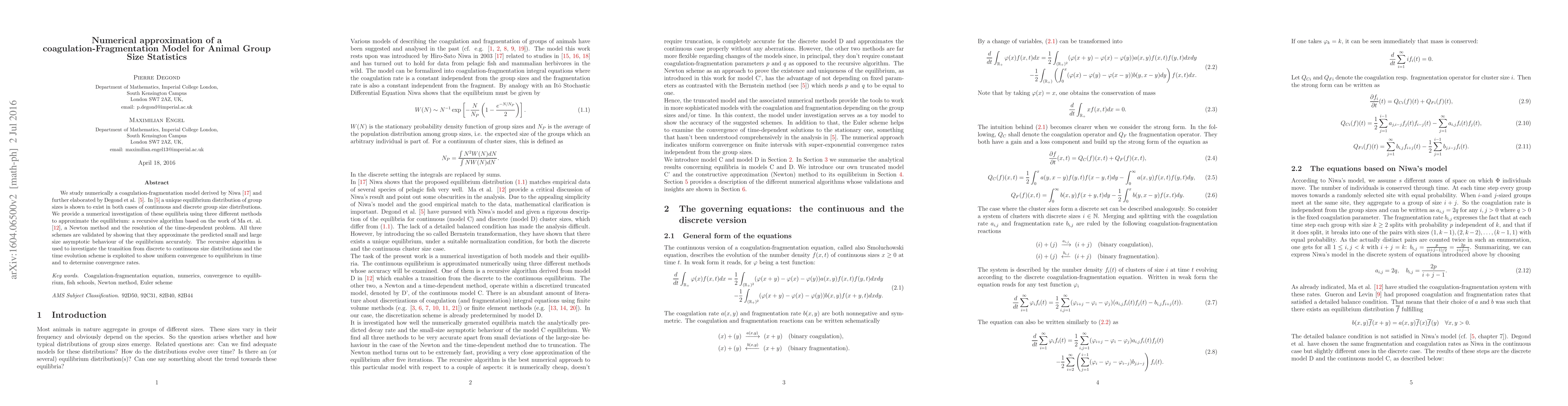 We study numerically a coagulation-fragmentation model derived by Niwa and further elaborated by Degond et al., where a unique equilibrium distribution of group sizes is shown to exist in both cases of continuous and discrete group size distributions. We provide a numerical investigation of these equilibria using three different methods to approximate the equilibrium: a recursive algorithm based on the work of Ma et. al., a Newton method and the resolution of the time-dependent problem. All three schemes are validated by showing that they approximate the predicted small and large size asymptotic behaviour of the equilibrium accurately. The recursive algorithm is used to investigate the transition from discrete to continuous size distributions and the time evolution scheme is exploited to show uniform convergence to equilibrium in time and to determine convergence rates.