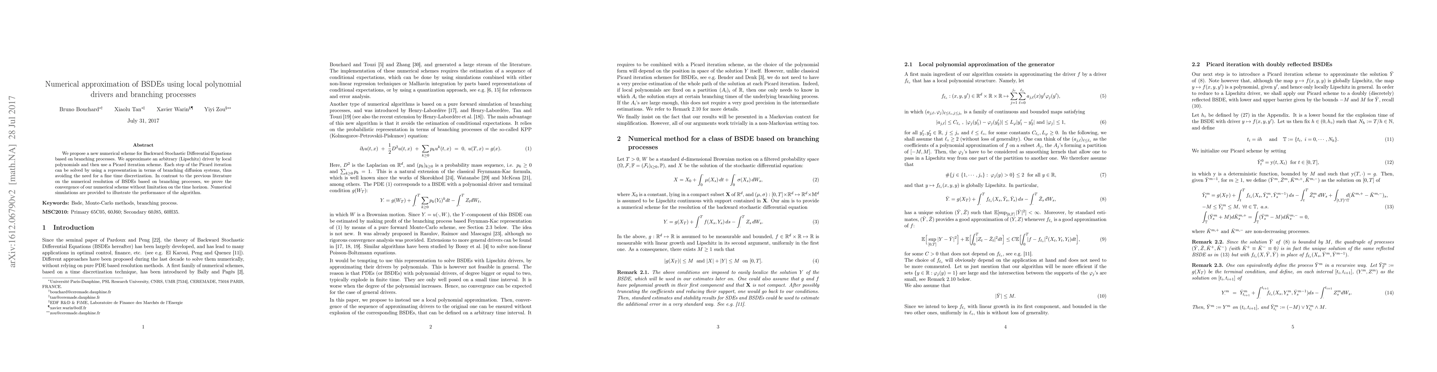 A new numerical scheme for solving Backward Stochastic Differential Equations uses local polynomial drivers and branching processes to achieve convergence without a limit on time horizon.