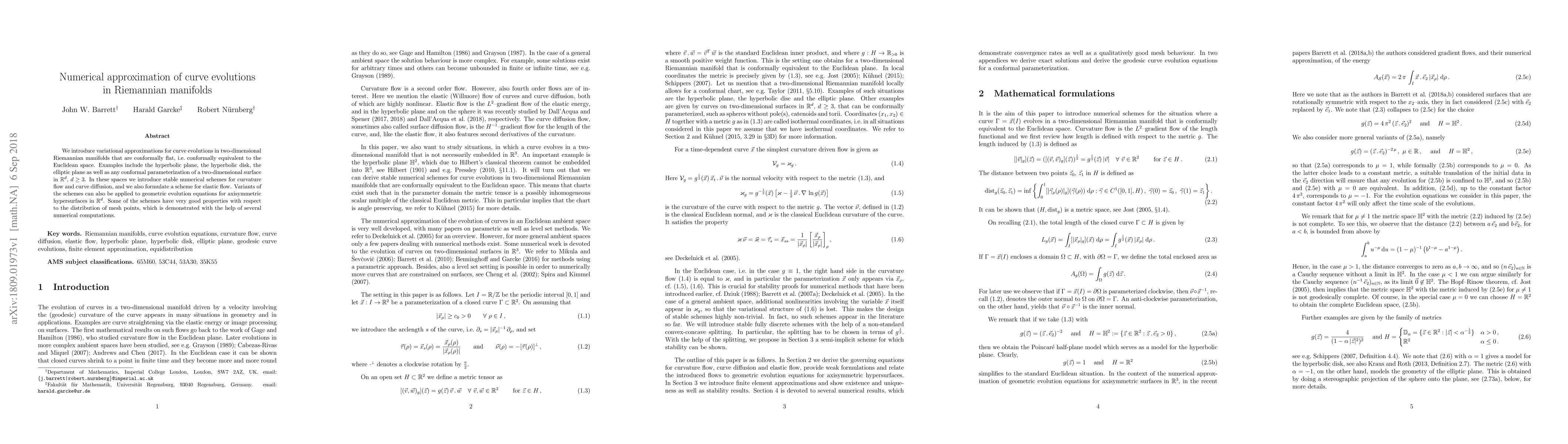 We introduce variational approximations for curve evolutions in two-dimensional Riemannian manifolds that are conformally flat, i.e.\ conformally equivalent to the Euclidean space. Examples include the hyperbolic plane, the hyperbolic disk, the elliptic plane as well as any conformal parameterization of a two-dimensional surface in ${\mathbb R}^d$, $d\geq 3$. In these spaces we introduce stable numerical schemes for curvature flow and curve diffusion, and we also formulate a scheme for elastic flow. Variants of the schemes can also be applied to geometric evolution equations for axisymmetric hypersurfaces in ${\mathbb R}^d$. Some of the schemes have very good properties with respect to the distribution of mesh points, which is demonstrated with the help of several numerical computations.