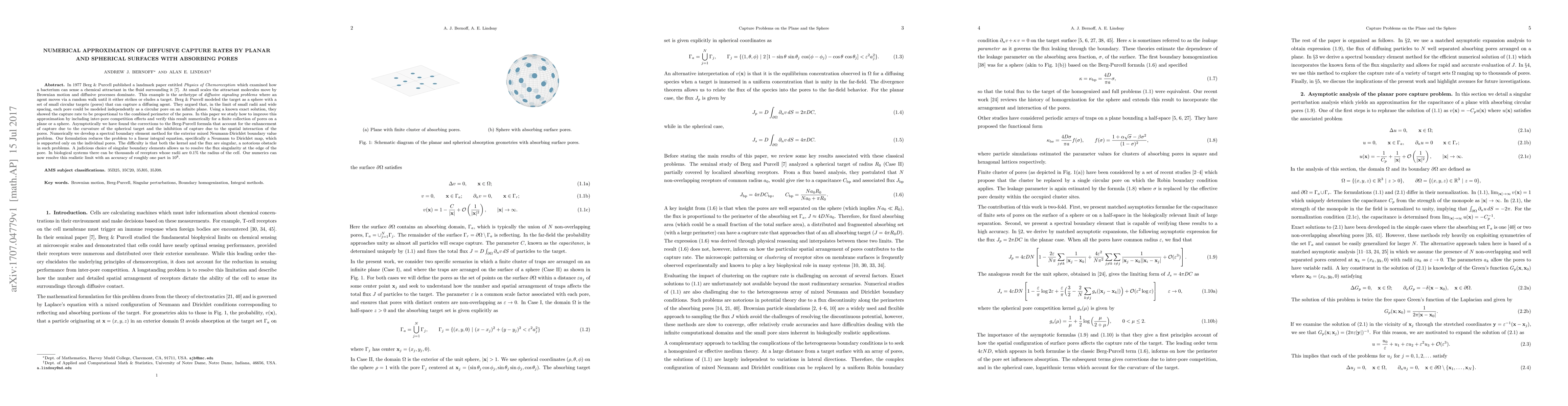 In 1977 Berg & Purcell published a landmark paper entitled "Physics of Chemoreception" which examined how a bacterium can sense a chemical attractant in the fluid surrounding it. At small scales the attractant molecules move by Brownian motion and diffusive processes dominate. This example is the archetype of diffusive signaling problems where an agent moves via a random walk until it either strikes or eludes a target. Berg & Purcell modeled the target as a sphere with a set of small circular targets (pores) that can capture a diffusing agent. They argued that, in the limit of small radii and wide spacing, each pore could be modeled independently as a circular pore on an infinite plane. Using a known exact solution, they showed the capture rate to be proportional to the combined perimeter of the pores. In this paper we study how to improve this approximation by including inter-pore competition effects and verify this result numerically for a finite collection of pores on a plane or sphere. Asymptotically we have found the corrections to the Berg-Purcell formula that account for enhancement of capture due to the curvature of the spherical target and inhibition of capture due to spatial interactions of the pores. Numerically we develop a spectral boundary element method for the exterior mixed Neumann-Dirichlet boundary value problem. Our formulation reduces the problem to a linear integral equation, specifically a Neumann to Dirichlet map, which is supported only on the individual pores. The difficulty is that both the kernel and the flux are singular, a notorious obstacle in such problems. A judicious choice of singular boundary elements allows us to resolve the flux singularity at the edge of the pore. In biological systems there can be thousands of receptors whose radii are 0.1% the cell radius. Our numerics resolve this realistic limit with an accuracy of roughly one part in 10^8.