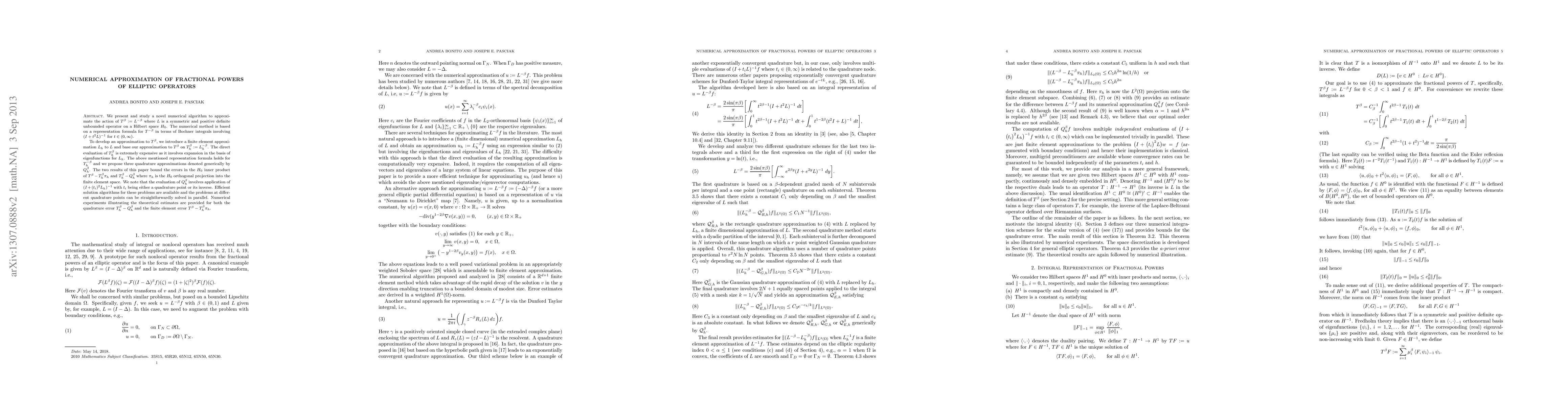 A new numerical algorithm approximates fractional powers of elliptic operators using a representation formula involving Bochner integrals, offering efficient solutions with guaranteed error bounds for both finite element and quadrature approximations.