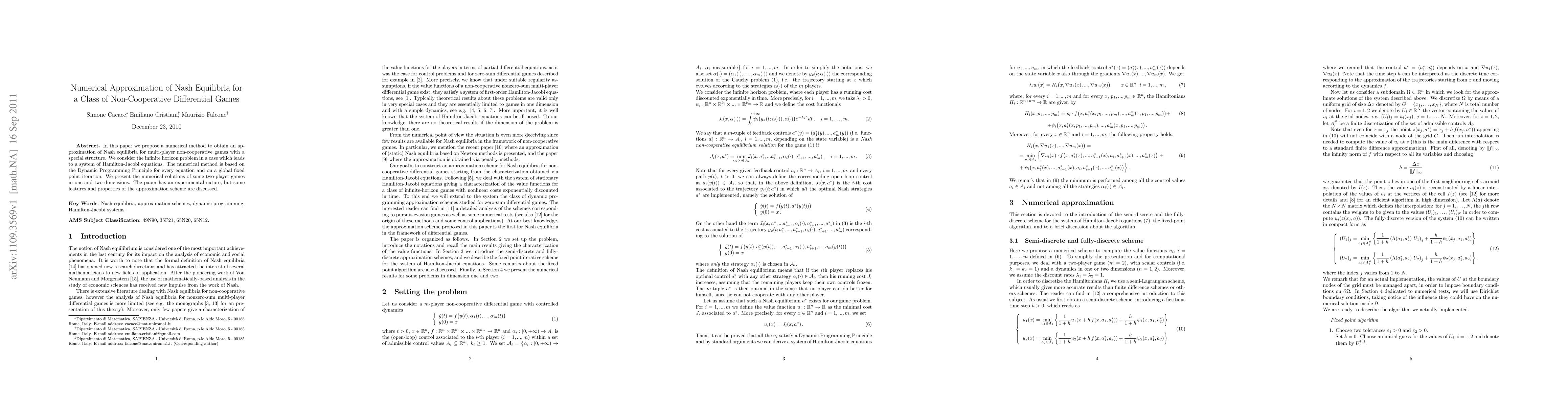 In this paper we propose a numerical method to obtain an approximation of Nash equilibria for multi-player non-cooperative games with a special structure. We consider the infinite horizon problem in a case which leads to a system of Hamilton-Jacobi equations. The numerical method is based on the Dynamic Programming Principle for every equation and on a global fixed point iteration. We present the numerical solutions of some two-player games in one and two dimensions. The paper has an experimental nature, but some features and properties of the approximation scheme are discussed.