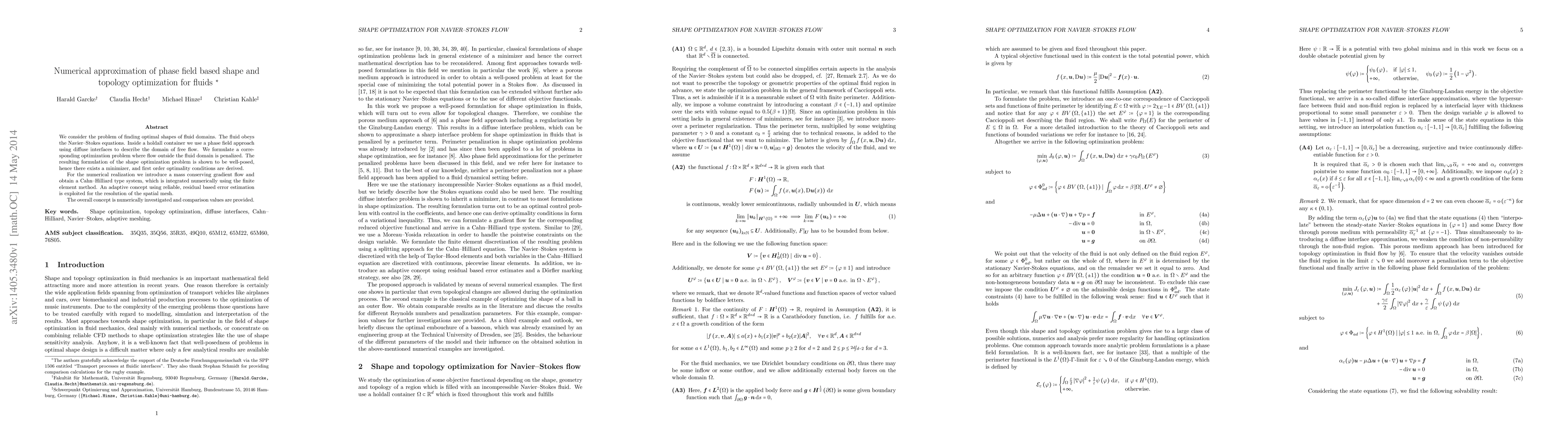This paper presents a numerical method for optimizing fluid domain shapes using a phase field approach based on the Navier-Stokes equations. It employs a gradient flow and Cahn-Hilliard system, solved via finite element methods, with adaptive mesh refinement for accuracy.