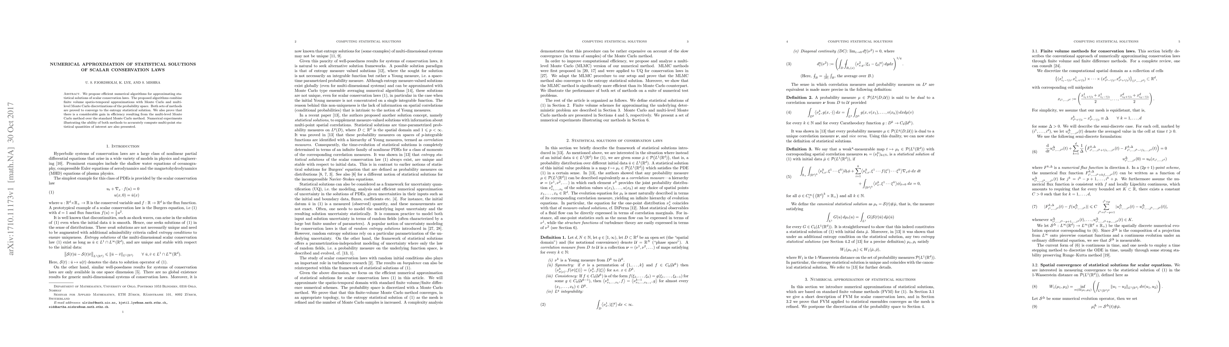 This paper proposes efficient numerical algorithms combining finite volume methods with Monte Carlo techniques to approximate statistical solutions of scalar conservation laws, proving convergence to entropy solutions and demonstrating efficiency gains from multi-level Monte Carlo over standard Monte Carlo methods, supported by numerical experiments.