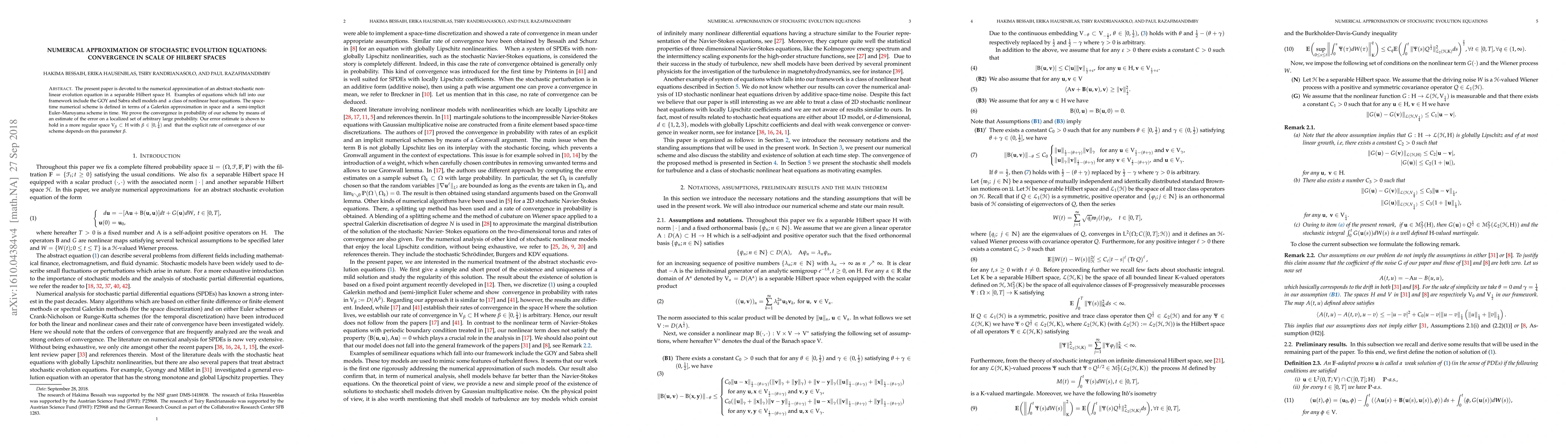 The present paper is devoted to the numerical approximation of an abstract stochastic nonlinear evolution equation in a separable Hilbert space {$\mathrm{H}$}. Examples of equations which fall into our framework include the GOY and Sabra shell models and { a class of nonlinear heat equations.} The space-time numerical scheme is defined in terms of a Galerkin approximation in space and a { semi-implicit Euler--Maruyama scheme in time}. {We prove the convergence in probability of our scheme by means of an estimate of the error on a localized set of arbitrary large probability.} Our error estimate is shown to hold in a more regular space $\mathrm{V}_{\beta}\subset \mathrm{H}$ with $\beta \in [0,\frac14)$ and { that the explicit rate of convergence of our scheme depends on this parameter $\beta$. }