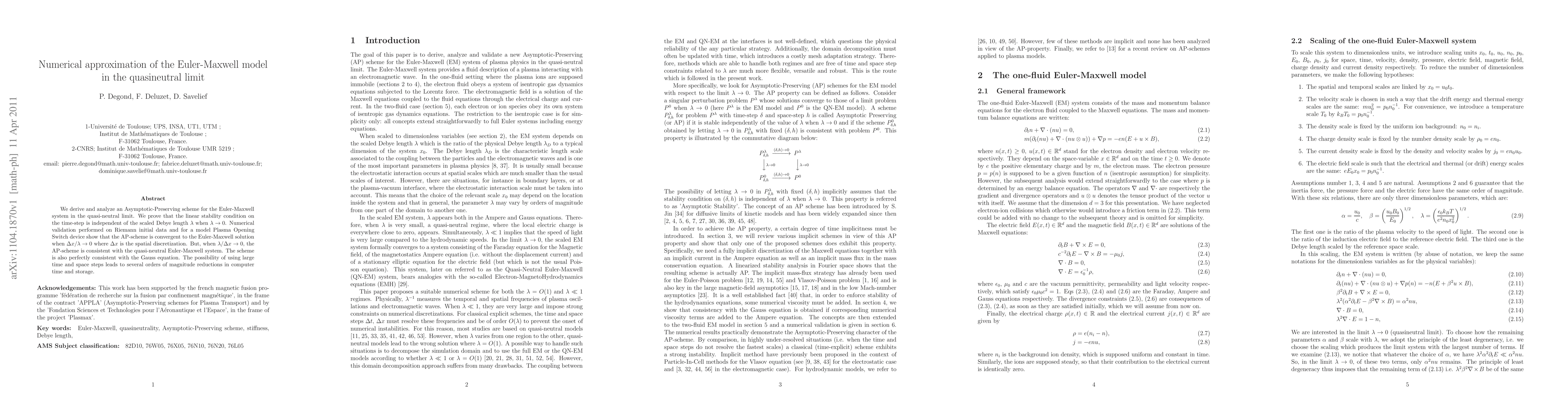 We derive and analyze an Asymptotic-Preserving scheme for the Euler-Maxwell system in the quasi-neutral limit. We prove that the linear stability condition on the time-step is independent of the scaled Debye length $\lambda$ when $\lambda \to 0$. Numerical validation performed on Riemann initial data and for a model Plasma Opening Switch device show that the AP-scheme is convergent to the Euler-Maxwell solution when $\Delta x/ \lambda \to 0$ where $\Delta x$ is the spatial discretization. But, when $\lambda /\Delta x \to 0$, the AP-scheme is consistent with the quasi-neutral Euler-Maxwell system. The scheme is also perfectly consistent with the Gauss equation. The possibility of using large time and space steps leads to several orders of magnitude reductions in computer time and storage.