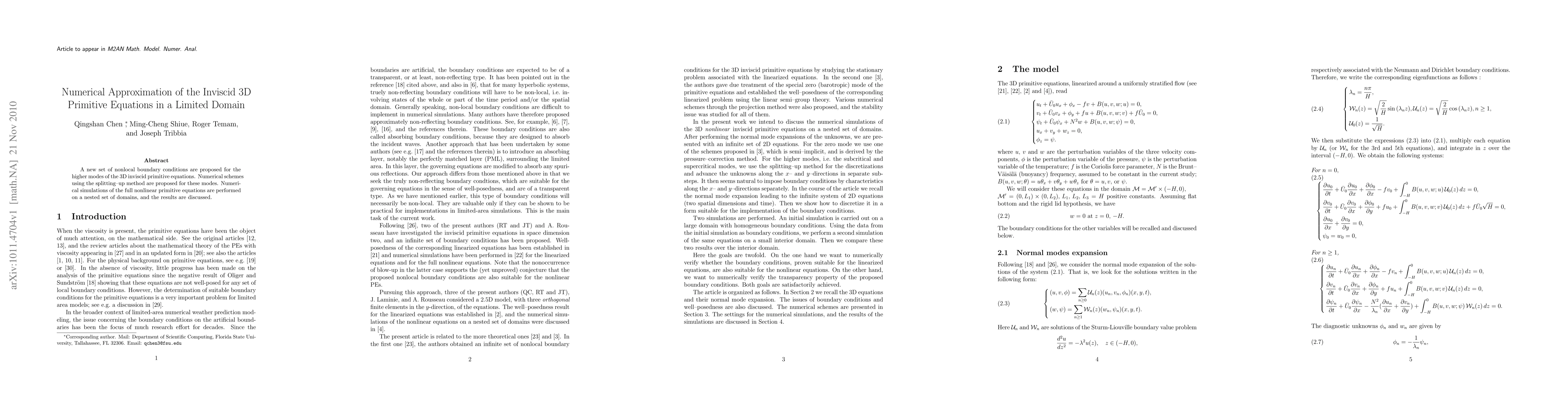 A new set of nonlocal boundary conditions are proposed for the higher modes of the 3D inviscid primitive equations. Numerical schemes using the splitting-up method are proposed for these modes. Numerical simulations of the full nonlinear primitive equations are performed on a nested set of domains, and the results are discussed.