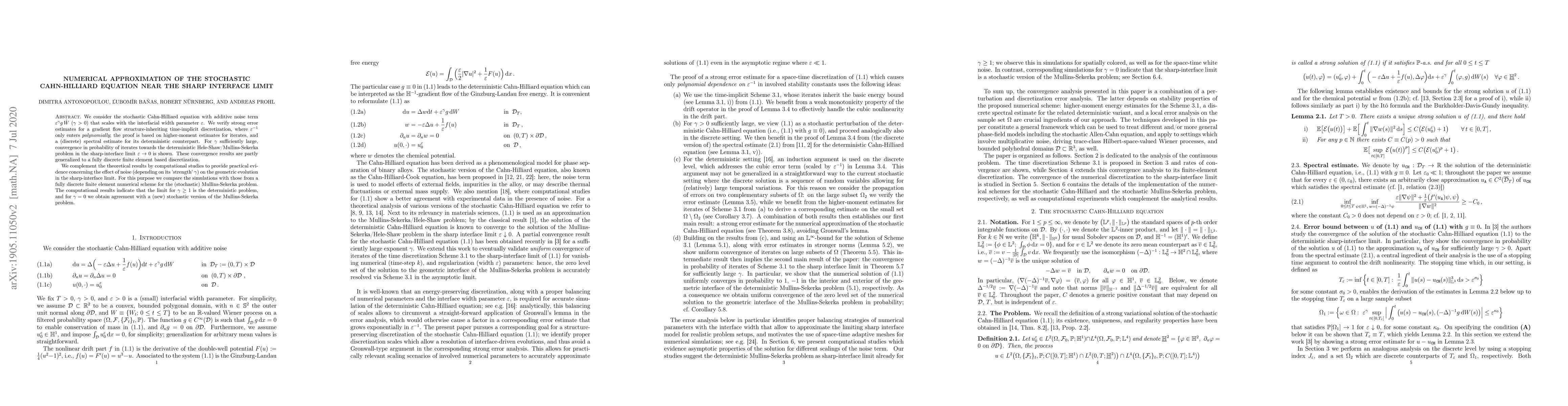 The paper presents a novel time-implicit discretization method for the stochastic Cahn-Hilliard equation that maintains strong error estimates and converges in probability to the deterministic Hele-Shaw/Mullins-Sekerka problem as ε → 0 for large γ.