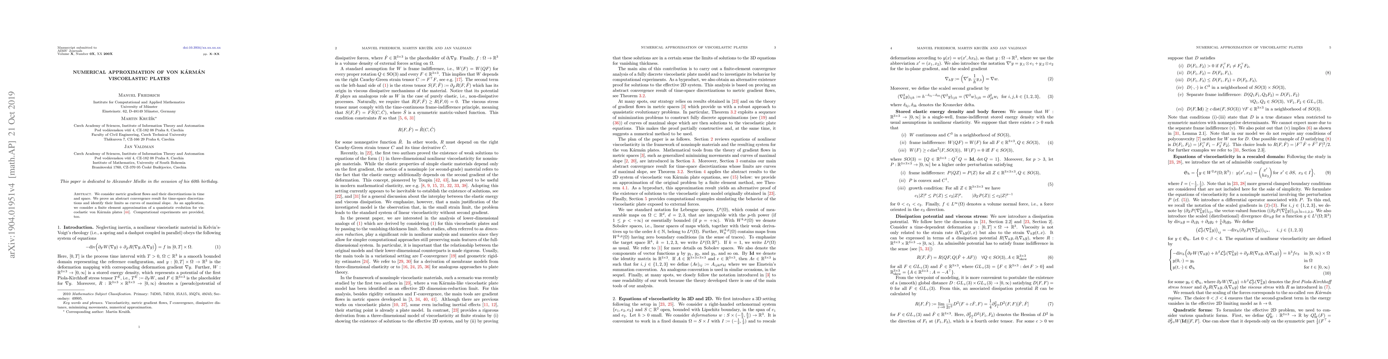 We consider metric gradient flows and their discretizations in time and space. We prove an abstract convergence result for time-space discretizations and identify their limits as curves of maximal slope. As an application, we consider a finite element approximation of a quasistatic evolution for viscoelastic von K\'{a}rm\'{a}n plates. Computational experiments are provided, too.