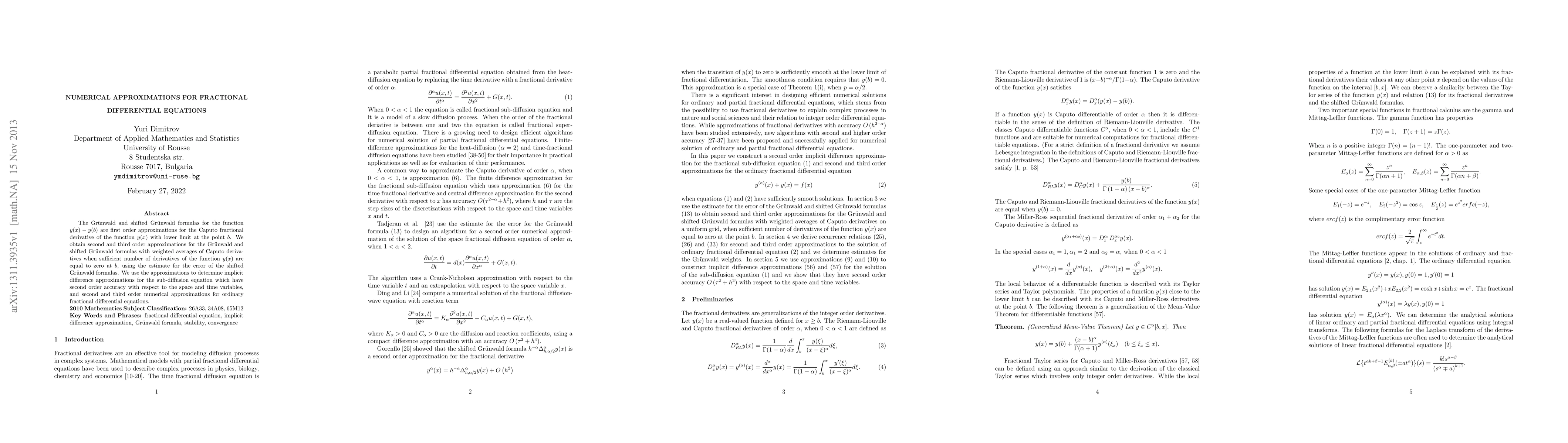 The Gr\"unwald and shifted Gr\"unwald formulas for the function $y(x)-y(b)$ are first order approximations for the Caputo fractional derivative of the function $y(x)$ with lower limit at the point $b$. We obtain second and third order approximations for the Gr\"unwald and shifted Gr\"unwald formulas with weighted averages of Caputo derivatives when sufficient number of derivatives of the function $y(x) $ are equal to zero at $b$, using the estimate for the error of the shifted Gr\"unwald formulas. We use the approximations to determine implicit difference approximations for the sub-diffusion equation which have second order accuracy with respect to the space and time variables, and second and third order numerical approximations for ordinary fractional differential equations.