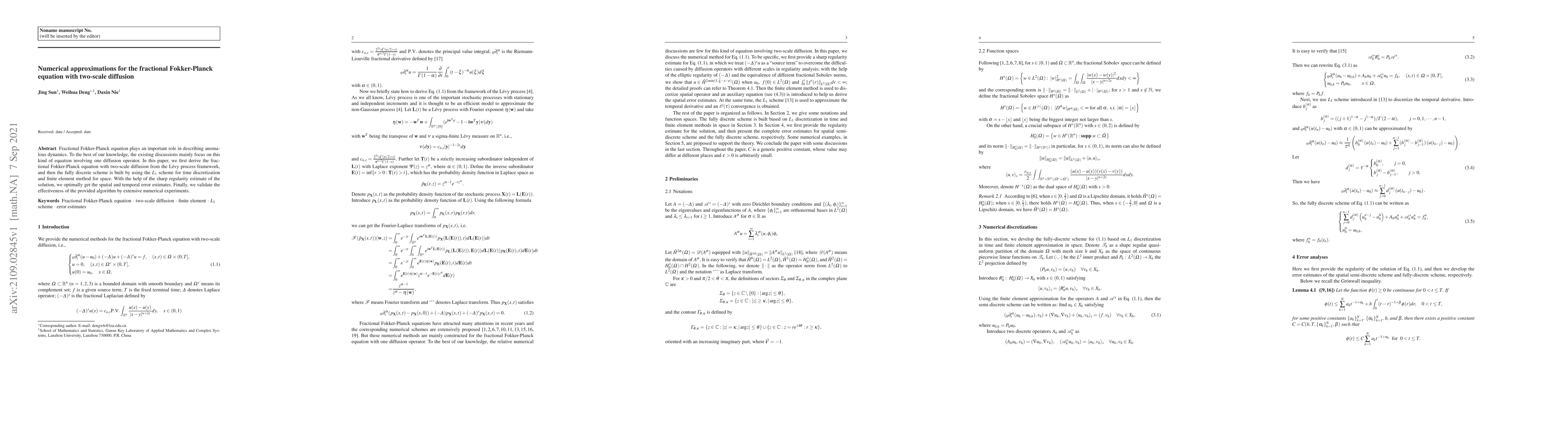 This paper derives the fractional Fokker-Planck equation with two-scale diffusion from the L\'evy process framework and develops a fully discrete numerical scheme using the $L_{1}$ scheme and finite element method. It provides optimal error estimates and validates the method through numerical experiments.
