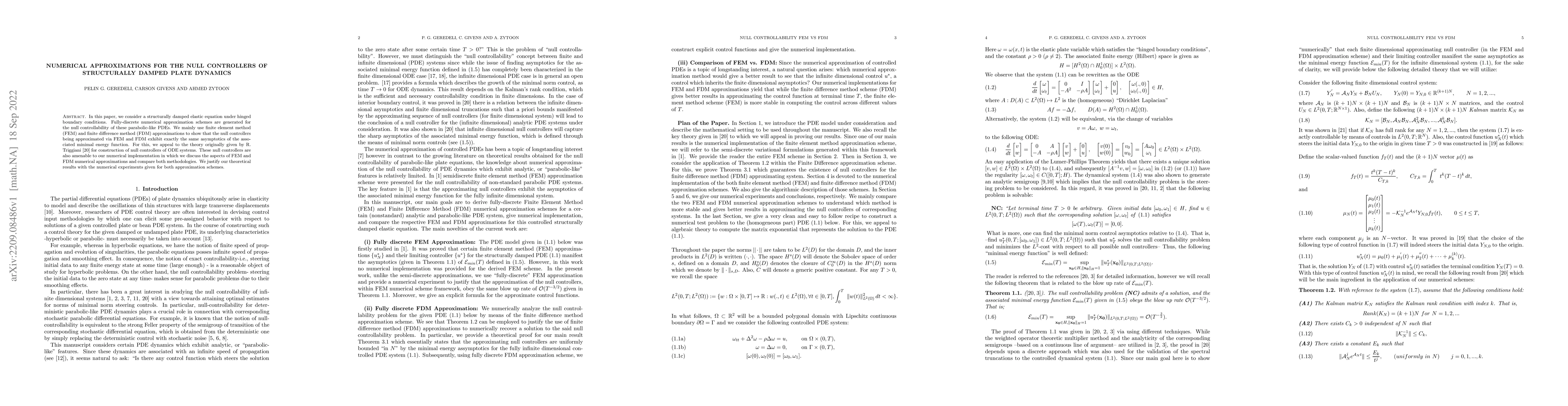 This paper develops fully-discrete numerical approximation schemes using FEM and FDM for the null controllability of structurally damped plate dynamics under hinged boundary conditions. It shows that both methods yield the same asymptotic behavior for the minimal energy function, justified by theoretical results and numerical experiments.