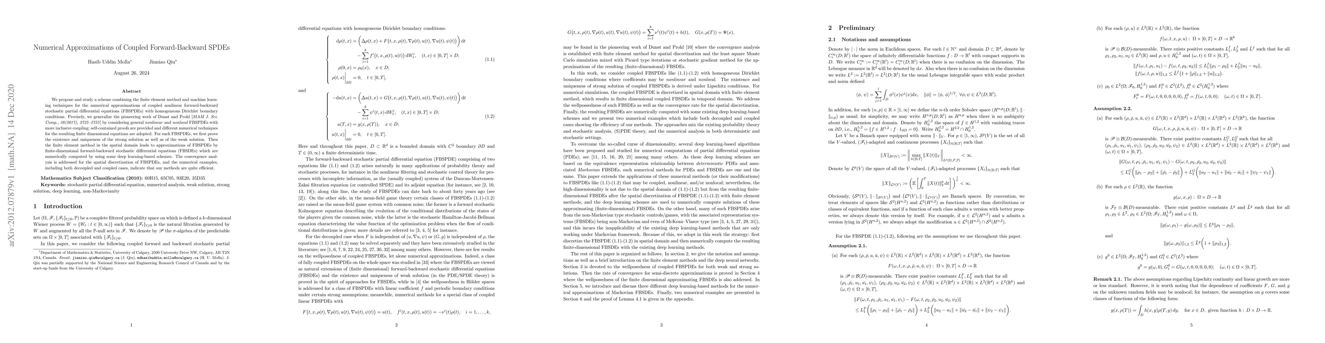 This paper proposes a novel scheme combining finite element methods and machine learning for approximating coupled nonlinear forward-backward stochastic partial differential equations (FBSPDEs). The authors prove the existence and uniqueness of solutions and demonstrate the efficiency of their methods through numerical examples.