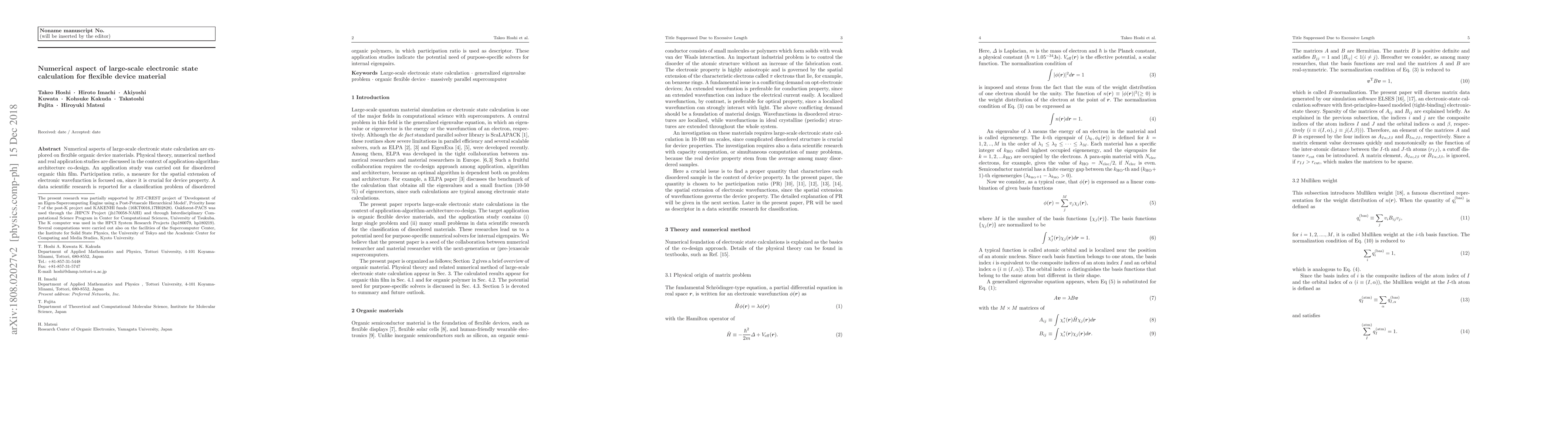Numerical aspects of large-scale electronic state calculation are explored on flexible organic device materials. Physical theory, numerical method and real application studies are discussed in the context of application-algorithm-architecture co-design. An application study was carried out for disordered organic thin film. Participation ratio, a measure for the spatial extension of electronic wavefunction is focused on, since it is crucial for device property. A data scientific research is reported for a classification problem of disordered organic polymers, in which participation ratio is used as descriptor. These application studies indicate the potential need of purpose-specific solvers for internal eigenpairs.