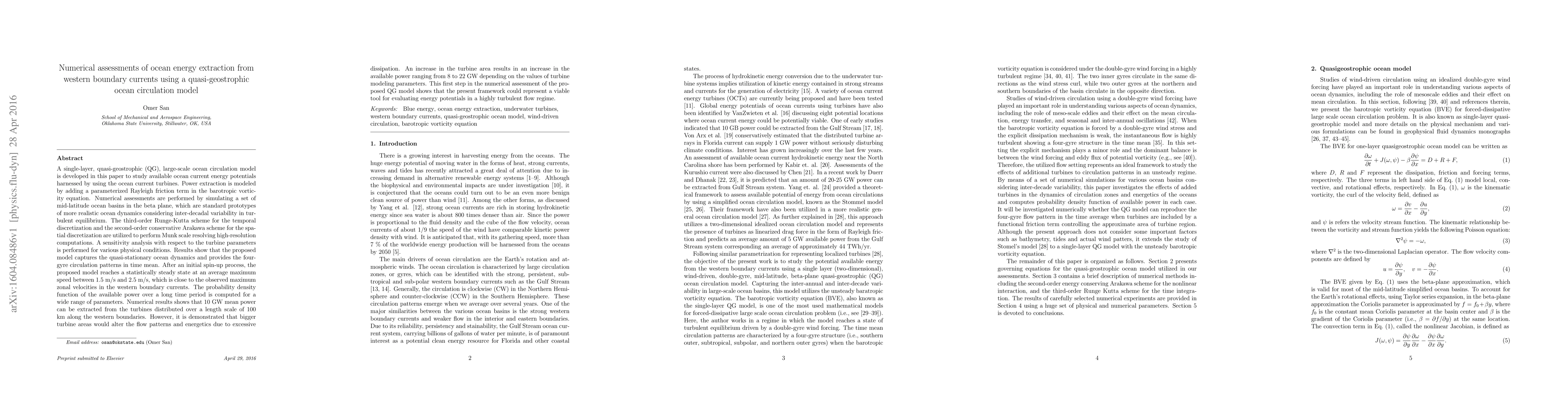 This paper develops a quasi-geostrophic ocean circulation model to evaluate ocean energy extraction from western boundary currents using turbines. The model achieves a statistically steady state at speeds comparable to observed currents, showing potential for extracting 10 GW of mean power, though larger turbine areas may disrupt flow patterns and energetics.