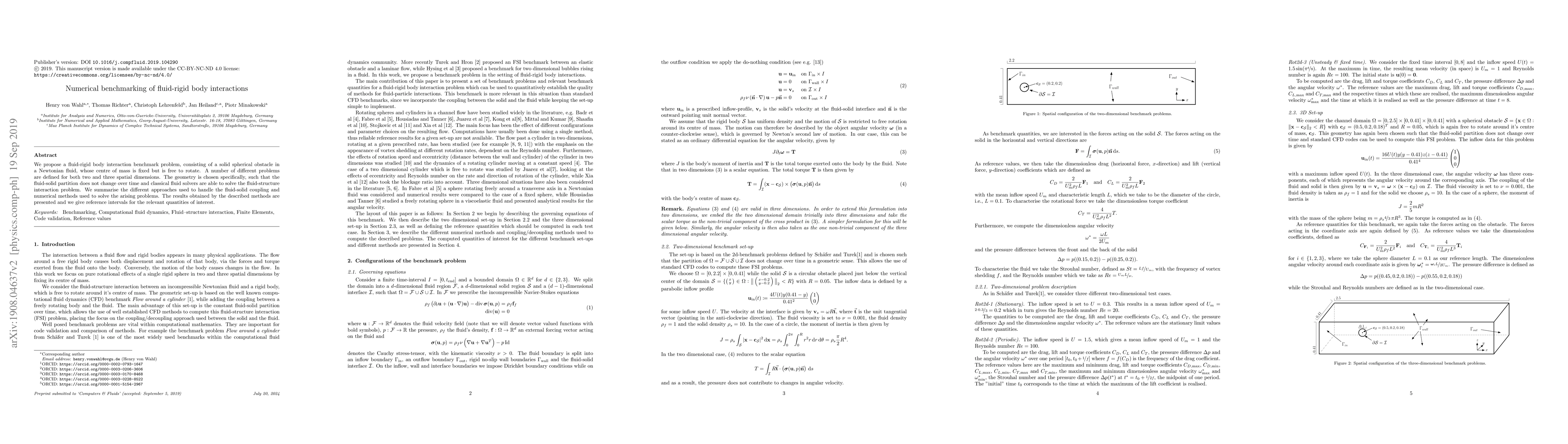 We propose a fluid-rigid body interaction benchmark problem, consisting of a solid spherical obstacle in a Newtonian fluid, whose centre of mass is fixed but is free to rotate. A number of different problems are defined for both two and three spatial dimensions. The geometry is chosen specifically, such that the fluid-solid partition does not change over time and classical fluid solvers are able to solve the fluid-structure interaction problem. We summarise the different approaches used to handle the fluid-solid coupling and numerical methods used to solve the arising problems. The results obtained by the described methods are presented and we give reference intervals for the relevant quantities of interest.