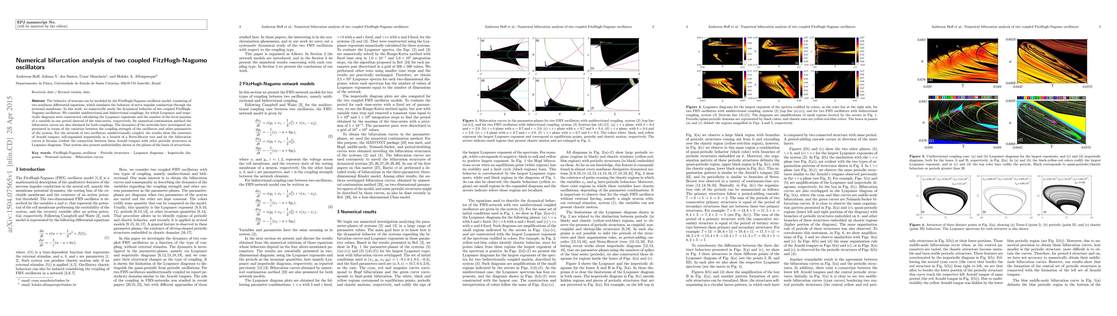 This paper numerically analyzes the dynamical behavior of two coupled FitzHugh-Nagumo oscillators, exploring both unidirectional and bidirectional couplings. It identifies bifurcation curves, Lyapunov exponents, and isoperiodic diagrams, revealing the existence of Arnold tongues and multistability in the system.