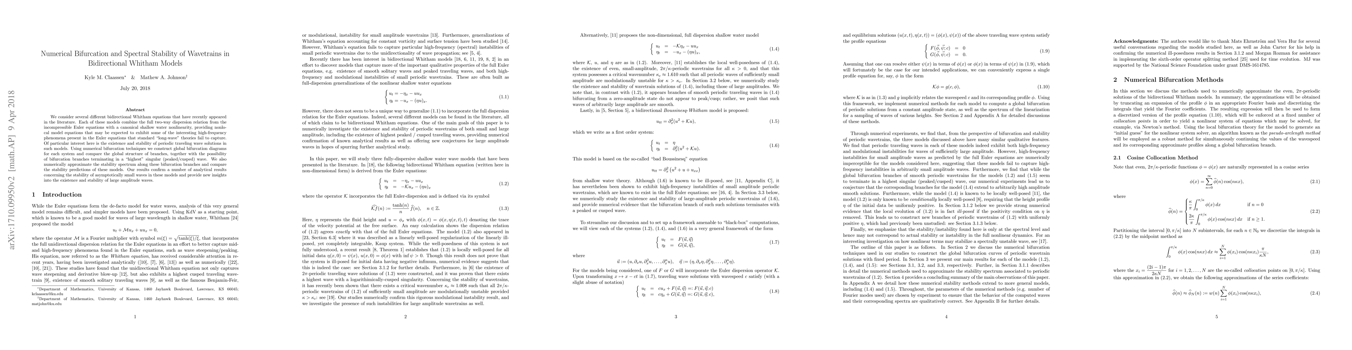 We consider several different bidirectional Whitham equations that have recently appeared in the literature. Each of these models combine the full two-way dispersion relation from the incompressible Euler equations with a canonical shallow water nonlinearity, providing nonlocal model equations that may be expected to exhibit some of the interesting high-frequency phenomena present in the Euler equations that standard "long-wave" theories fail to capture. Of particular interest here is the existence and stability of periodic traveling wave solutions in such models. Using numerical bifurcation techniques we construct global bifurcation diagrams for each system and compare the global structure of branches, together with the possibility of bifurcation branches terminating in a "highest" singular (peaked/cusped) wave. We also numerically approximate the stability spectrum along these bifurcation branches and compare the stability predictions of these models. Our results confirm a number of analytical results concerning the stability of asymptotically small waves in these models and provide new insights into the existence and stability of large amplitude waves.