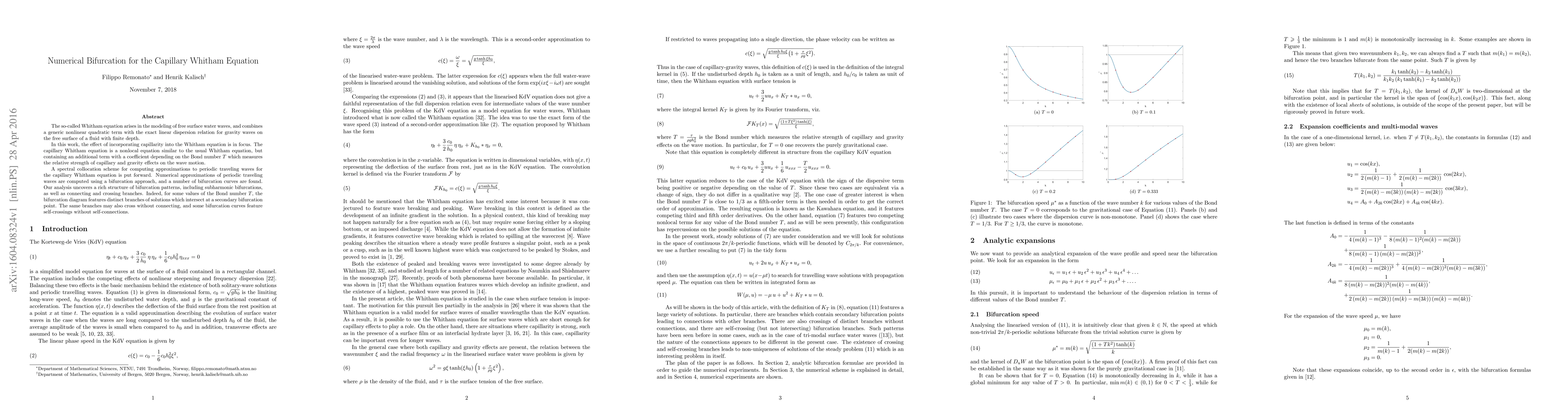 This paper investigates the capillary Whitham equation, which models free surface water waves with both capillary and gravity effects. It employs a spectral collocation scheme and a bifurcation approach to compute periodic traveling waves, revealing complex bifurcation patterns including subharmonic bifurcations, intersecting branches, and self-crossings without connections.