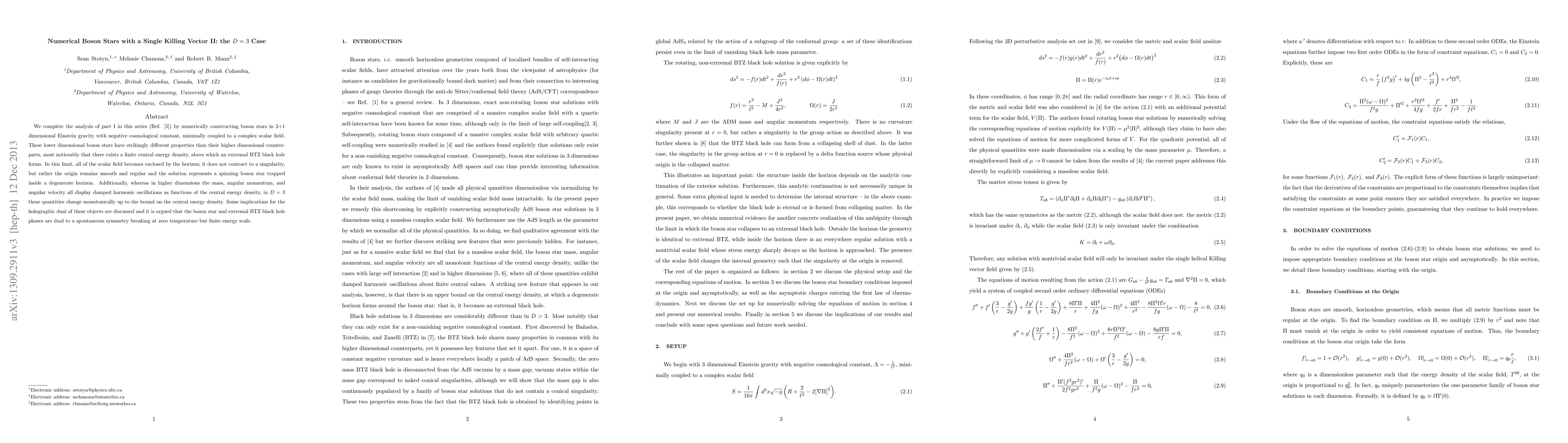 This paper completes the numerical analysis of boson stars in 2+1 dimensional Einstein gravity, showing that in three dimensions, these stars have a finite central energy density, leading to a spinning boson star within a degenerate horizon rather than a singularity. Unlike higher dimensions, mass, angular momentum, and angular velocity change monotonically in $D=3$.