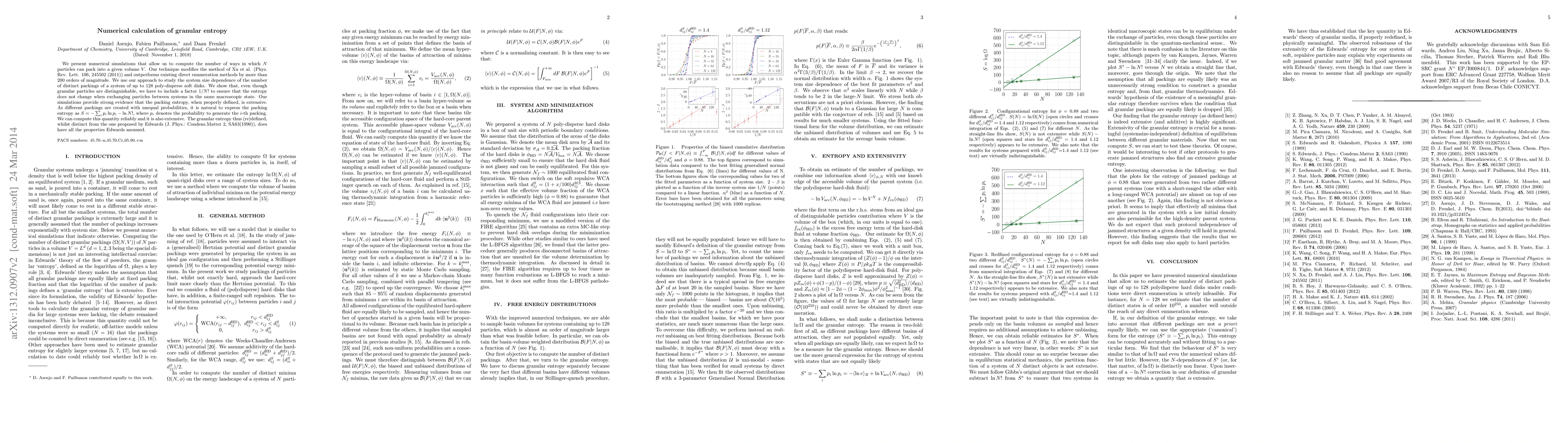 We present numerical simulations that allow us to compute the number of ways in which $N$ particles can pack into a given volume $V$. Our technique modifies the method of Xu et al. (Phys. Rev. Lett. 106, 245502 (2011)) and outperforms existing direct enumeration methods by more than 200 orders of magnitude. We use our approach to study the system size dependence of the number of distinct packings of a system of up to 128 poly-disperse soft disks. We show that, even though granular particles are distinguishable, we have to include a factor $1/N!$ to ensure that the entropy does not change when exchanging particles between systems in the same macroscopic state. Our simulations provide strong evidence that the packing entropy, when properly defined, is extensive. As different packings are created with unequal probabilities, it is natural to express the packing entropy as $S=-\sum_i p_i\ln p_i -\ln N!$, where $p_i$ denotes the probability to generate the $i$-th packing. We can compute this quantity reliably and it is also extensive. The granular entropy thus (re)defined, whilst distinct from the one proposed by Edwards assumed (J. Phys.: Condens.Matter 2, SA63(1990)), does have all the properties Edwards assumed.
