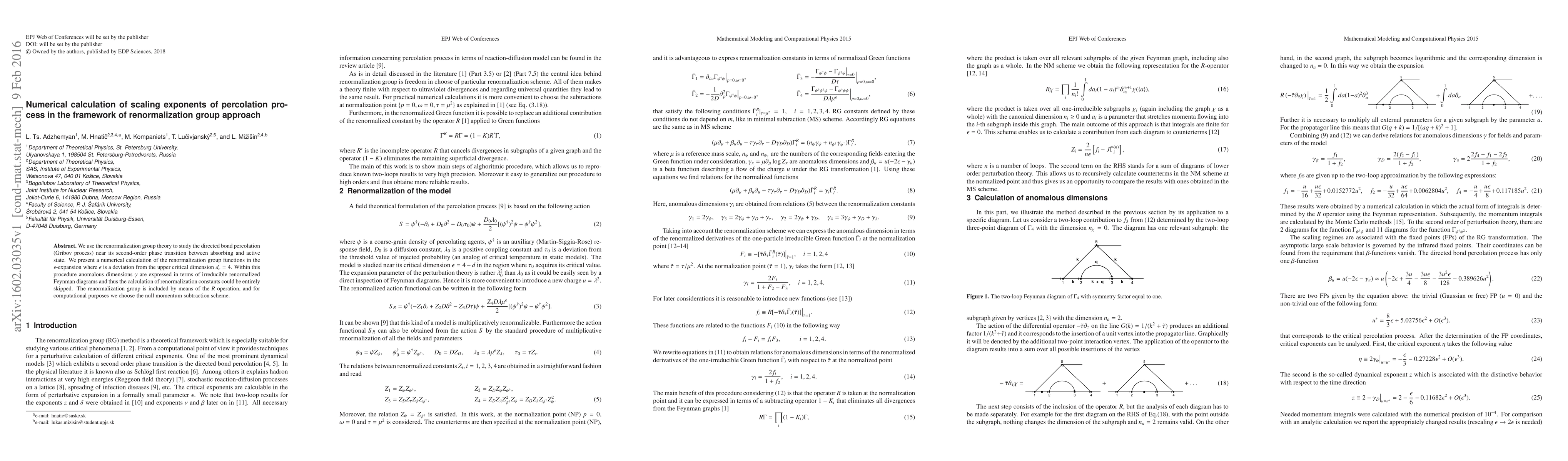 This study employs renormalization group theory to numerically calculate scaling exponents for directed bond percolation near its phase transition, using the $\epsilon$-expansion method to avoid the need for renormalization constants. The $R$ operation and null momentum subtraction scheme are utilized for computational efficiency.