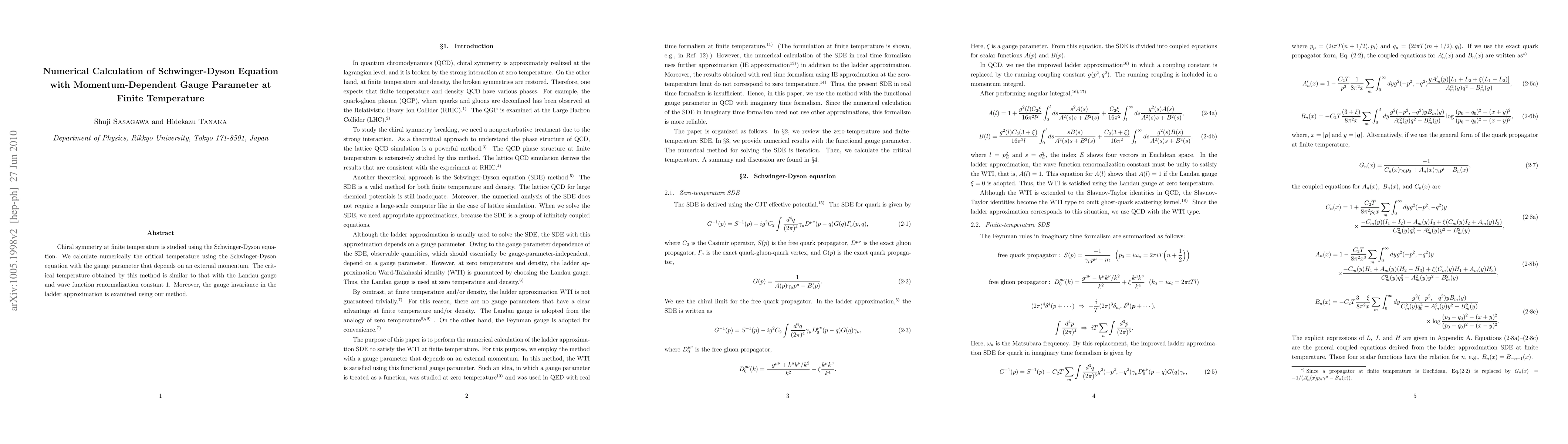 This paper numerically calculates the critical temperature for chiral symmetry at finite temperature using the Schwinger-Dyson equation with a momentum-dependent gauge parameter. Results show a critical temperature comparable to the Landau gauge, and gauge invariance in the ladder approximation is verified.