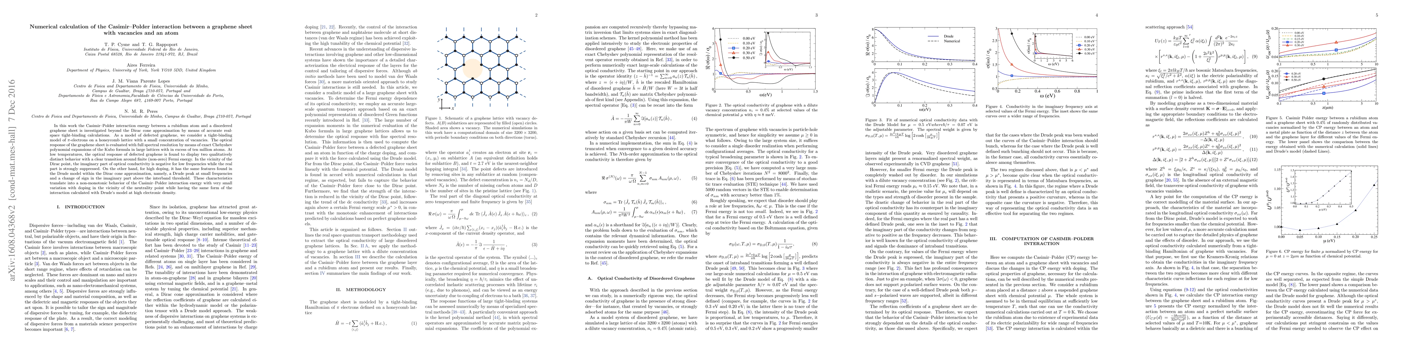 In this work the Casimir{Polder interaction energy between a rubidium atom and a disordered graphene sheet is investigated beyond the Dirac cone approximation by means of accurate real-space calculations. As a model of defected graphene, we consider a tight-binding model of \Pi-electrons on a honeycomb lattice with a small concentration of point defects. The optical response of the graphene sheet is evaluated with full spectral resolution by means of exact Chebyshev polynomial expansions of the Kubo formula in large lattices with in excess of ten million atoms. At low temperatures, the optical response of defected graphene is found to display two qualitatively distinct behavior with a clear transition around non-zero Fermi energy, \mu~\mu*. In the vicinity of the Dirac point, the imaginary part of optical conductivity is negative for low frequencies while the real part is strongly suppressed. On the other hand, for high doping, it has the same features found in the Drude model within the Dirac cone approximation, namely, a Drude peak at small frequencies and a change of sign in the imaginary part above the interband threshold \omega > 2\mu. These characteristics translate into a non-monotonic behavior of the Casimir{Polder interaction energy with very small variation with doping in the vicinity of the neutrality point while having the same form of the interaction calculated with Drude's model at high electronic density.