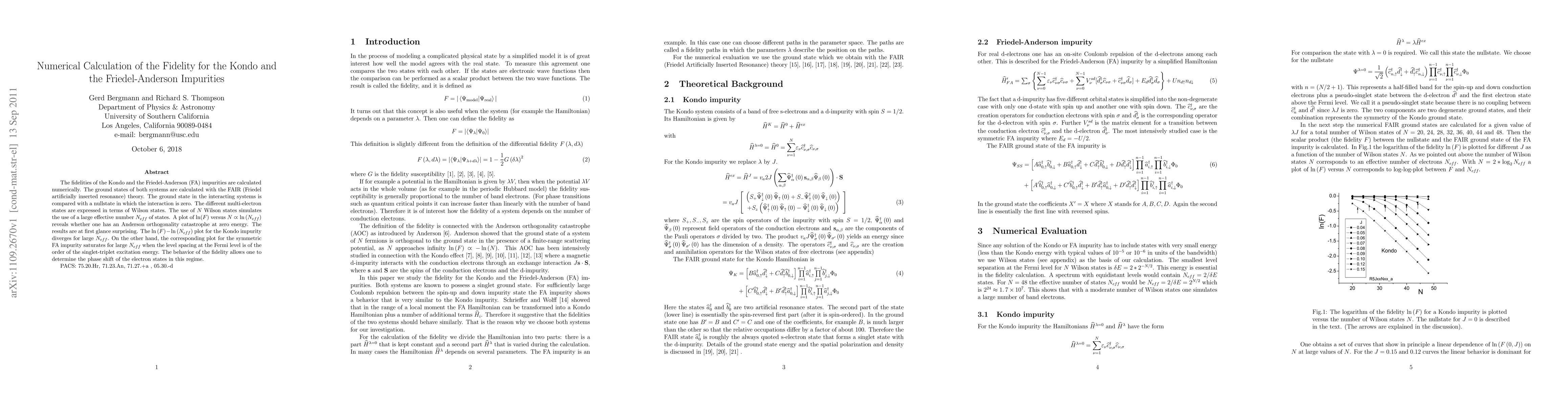 The fidelities of the Kondo and the Friedel-Anderson (FA) impurities are calculated numerically. The ground states of both systems are calculated with the FAIR (Friedel artificially inserted resonance) theory. The ground state in the interacting systems is compared with a nullstate in which the interaction is zero. The different multi-electron states are expressed in terms of Wilson states. The use of N Wilson states simulates the use of a large effective number N_{eff} of states. A plot of ln(F) versus N\proptoln(N_{eff}) reveals whether one has an Anderson orthogonality catastrophe at zero energy. The results are at first glance surprising. The ln(F)-ln(N_{eff}) plot for the Kondo impurity diverges for large N_{eff}. On the other hand, the corresponding plot for the symmetric FA impurity saturates for large N_{eff} when the level spacing at the Fermi level is of the order of the singlet-triplet excitation energy. The behavior of the fidelity allows one to determine the phase shift of the electron states in this regime. PACS: 75.20.Hr, 71.23.An, 71.27.+a, 05.30.-d