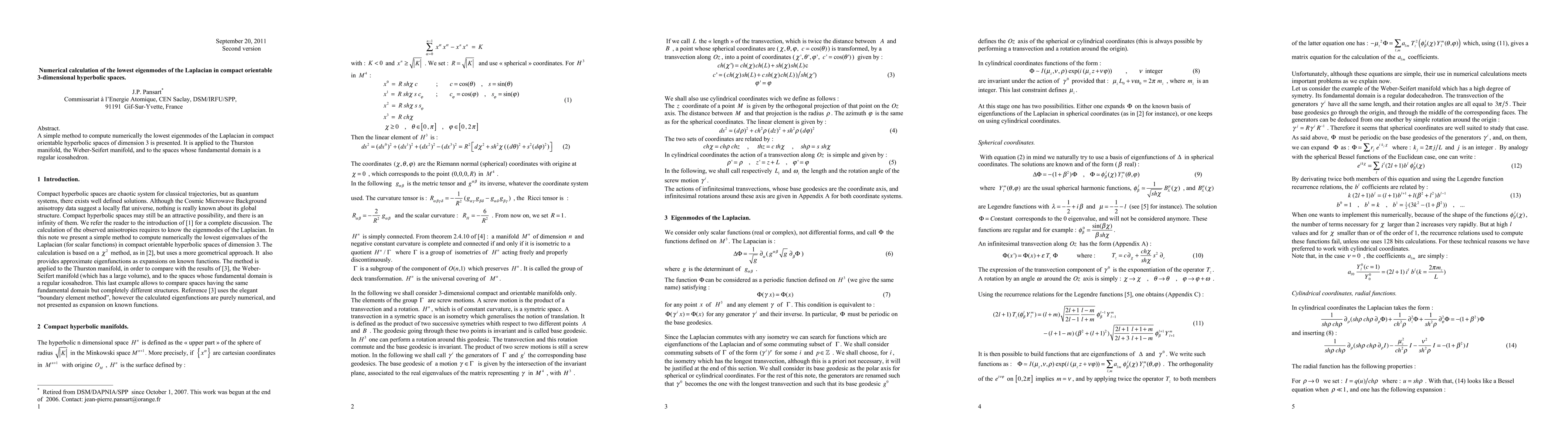 The paper presents a numerical method to compute the lowest eigenmodes of the Laplacian in compact orientable 3D hyperbolic spaces, specifically applied to the Thurston manifold, the Weber-Seifert manifold, and spaces with a regular icosahedron as their fundamental domain.