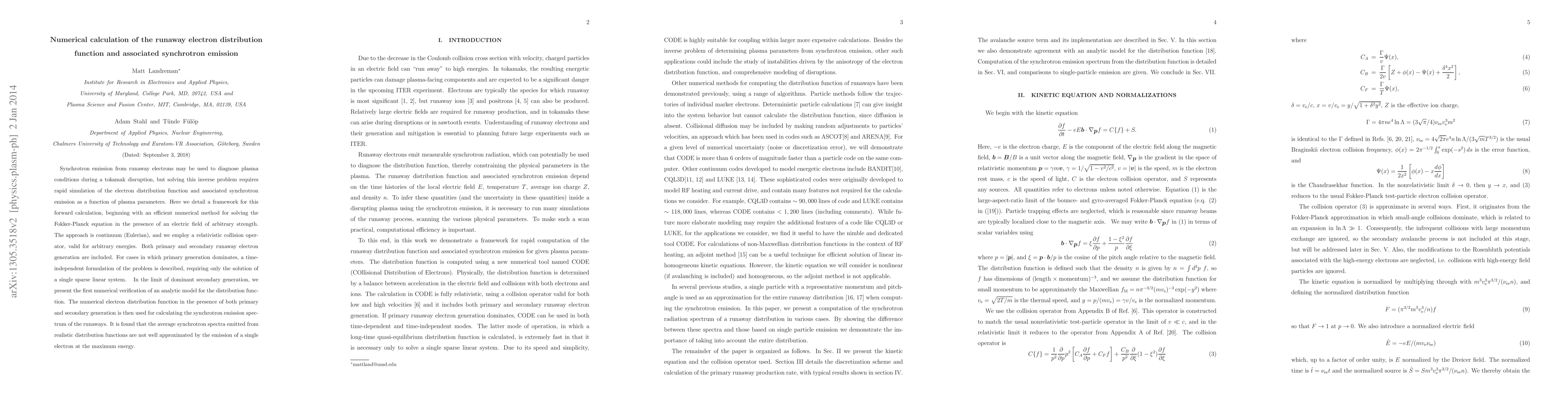 This paper presents a numerical framework for calculating the runaway electron distribution function and its synchrotron emission in tokamak disruptions, employing efficient methods to solve the Fokker-Planck equation and validating the model against analytic predictions. The study finds that average synchrotron spectra cannot be accurately represented by a single high-energy electron.