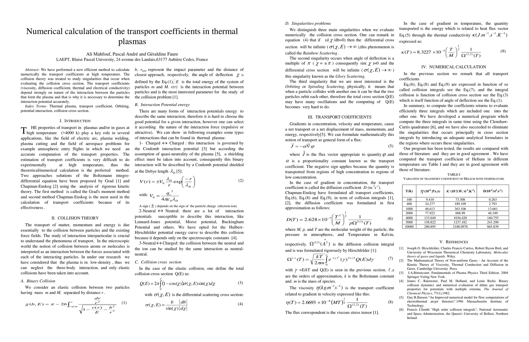 This paper introduces an efficient numerical method for calculating transport coefficients in thermal plasmas at high temperatures, addressing singularities in collision theory and emphasizing the importance of accurately determining interaction potentials for precise results.