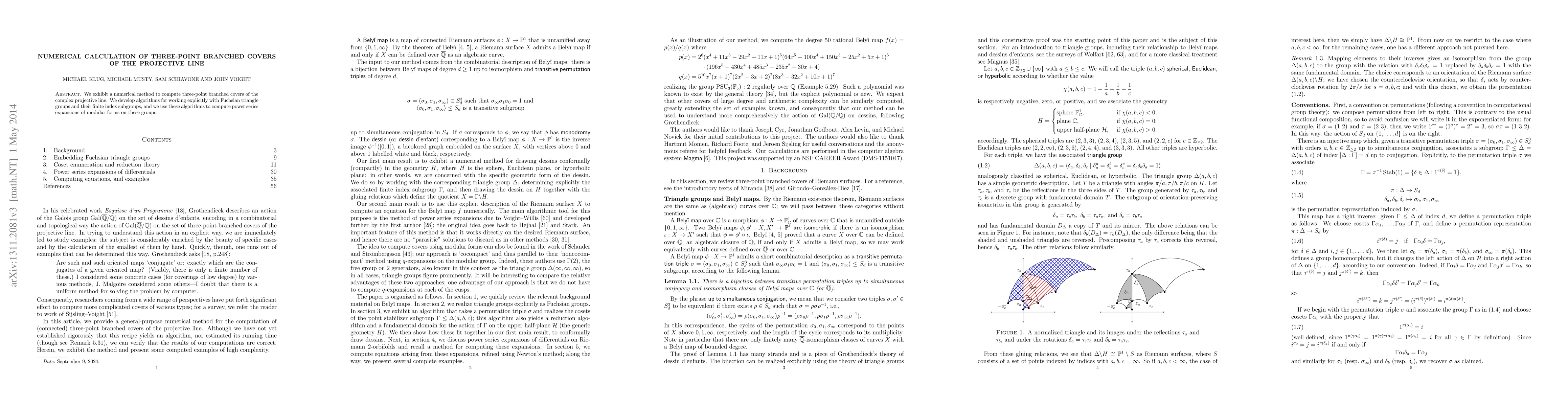 Summary: This paper presents a numerical method for computing three-point branched covers of the complex projective line, utilizing algorithms for Fuchsian triangle groups and their finite index subgroups to derive power series expansions of modular forms.