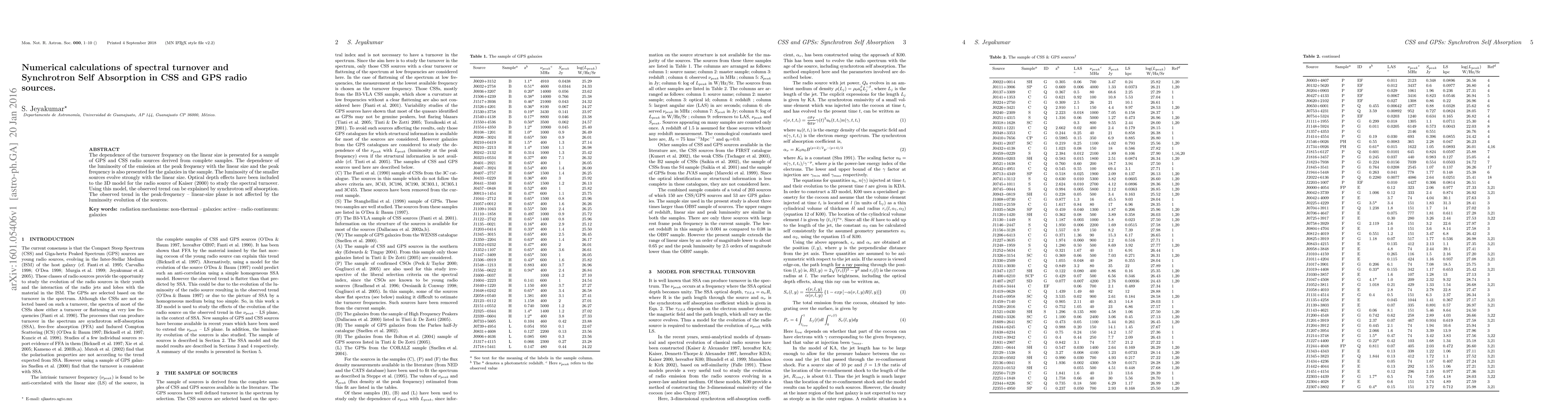 The dependence of the turnover frequency on the linear size is presented for a sample of GPS and CSS radio sources derived from complete samples. The dependence of the luminosity of the emission at the peak frequency with the linear size and the peak frequency is also presented for the galaxies in the sample. The luminosity of the smaller sources evolve strongly with the linear size. Optical depth effects have been included to the 3D model for the radio source of Kaiser (2000) to study the spectral turnover. Using this model, the observed trend can be explained by synchrotron self absorption. The observed trend in the peak-frequency -- linear-size plane is not affected by the luminosity evolution of the sources.