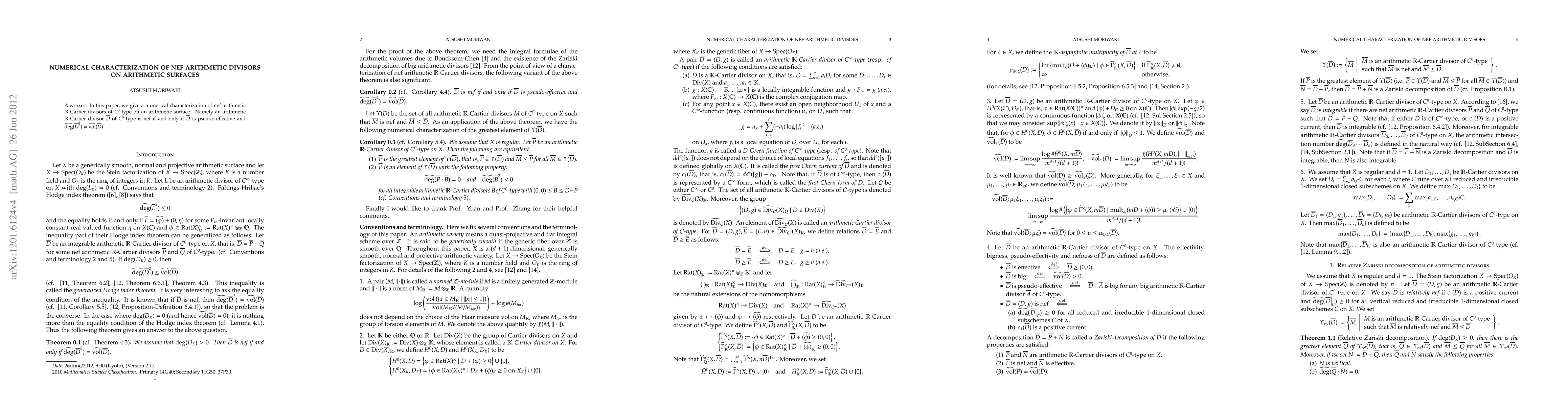 A research paper characterizes when arithmetic divisors on surfaces are non-negative effective (nef) in terms of their pseudo-effectiveness and relationship to volume, providing new insights for algebraic geometry.