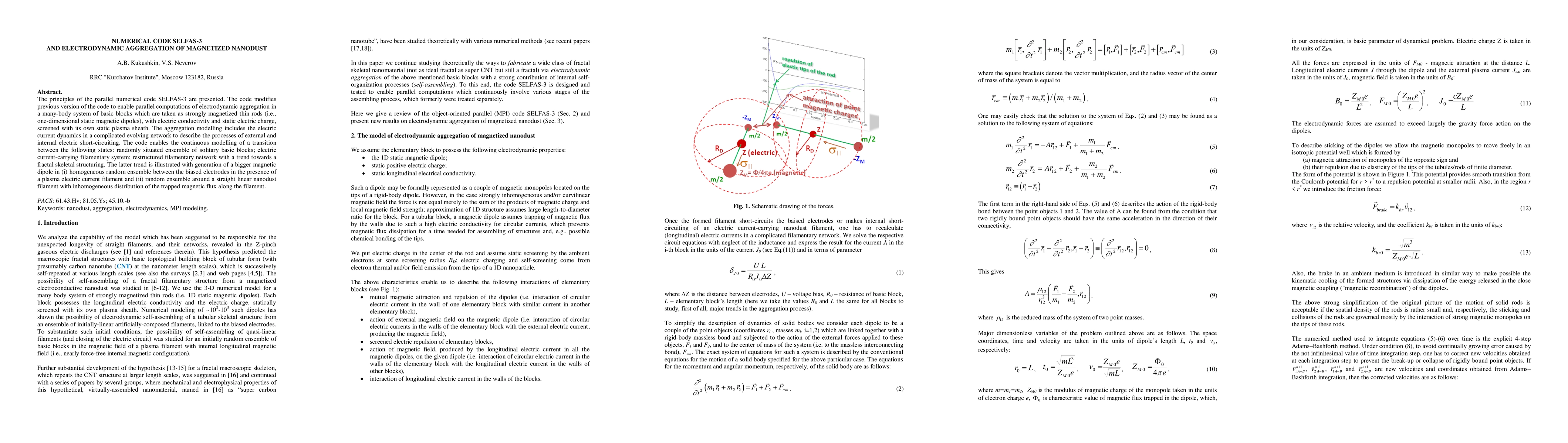 A numerical code called SELFAS-3 models electrodynamic aggregation of magnetized nanodust in a many-body system, simulating states from solitary blocks to fractal networks.