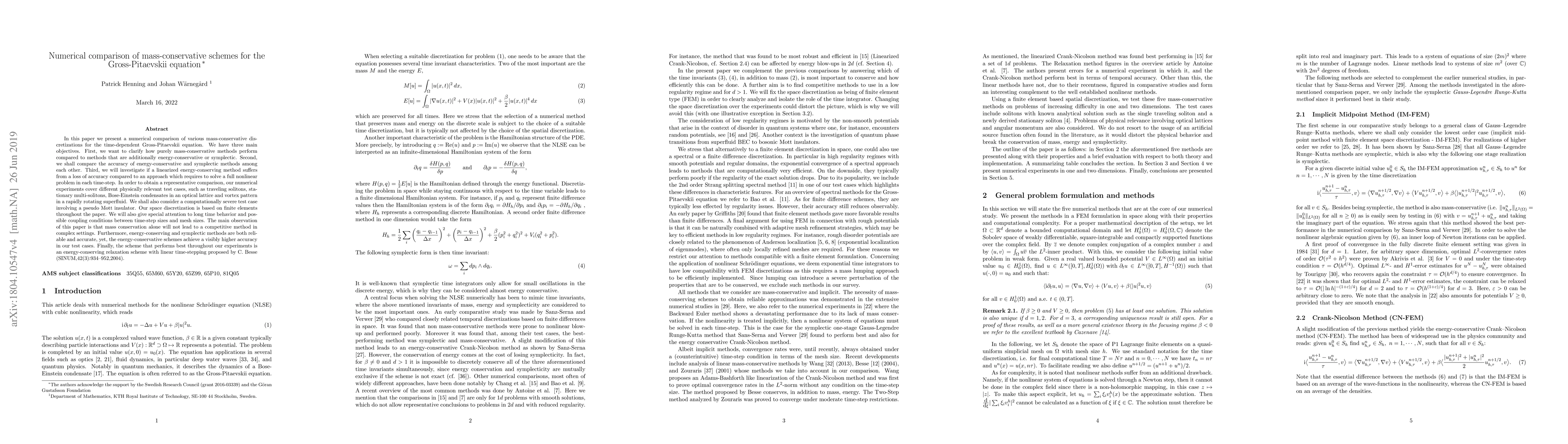 In this paper we present a numerical comparison of various mass-conservative discretizations for the time-dependent Gross-Pitaevskii equation. We have three main objectives. First, we want to clarify how purely mass-conservative methods perform compared to methods that are additionally energy-conservative or symplectic. Second, we shall compare the accuracy of energy-conservative and symplectic methods among each other. Third, we will investigate if a linearized energy-conserving method suffers from a loss of accuracy compared to an approach which requires to solve a full nonlinear problem in each time-step. In order to obtain a representative comparison, our numerical experiments cover different physically relevant test cases, such as traveling solitons, stationary multi-solitons, Bose-Einstein condensates in an optical lattice and vortex pattern in a rapidly rotating superfluid. We shall also consider a computationally severe test case involving a pseudo Mott insulator. Our space discretization is based on finite elements throughout the paper. We will also give special attention to long time behavior and possible coupling conditions between time-step sizes and mesh sizes. The main observation of this paper is that mass conservation alone will not lead to a competitive method in complex settings. Furthermore, energy-conserving and symplectic methods are both reliable and accurate, yet, the energy-conservative schemes achieve a visibly higher accuracy in our test cases. Finally, the scheme that performs best throughout our experiments is an energy-conserving relaxation scheme with linear time-stepping proposed by C. Besse (SINUM,42(3):934--952,2004).