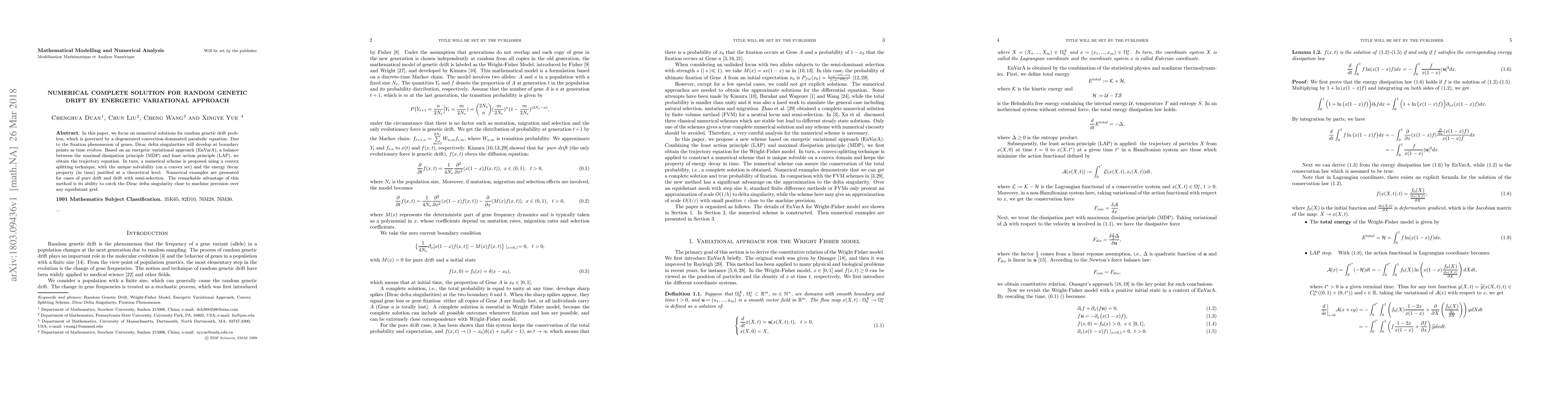 This paper proposes an energetic variational approach (EnVarA) to solve the random genetic drift problem, governed by a convection-dominated parabolic equation. The method balances maximal dissipation and least action principles to derive a trajectory equation, and a numerical scheme using convex splitting ensures unique solvability and energy decay, effectively capturing Dirac delta singularities.