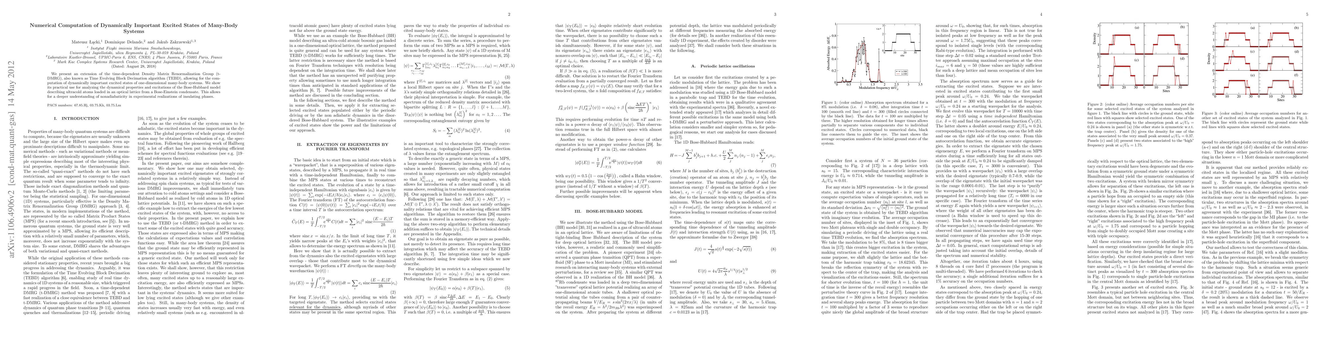 This paper extends the time-dependent Density Matrix Renormalization Group (t-DMRG) to compute dynamically important excited states in one-dimensional many-body systems, demonstrating its application to the Bose-Hubbard model to analyze nonadiabaticity in ultracold atoms in optical lattices.