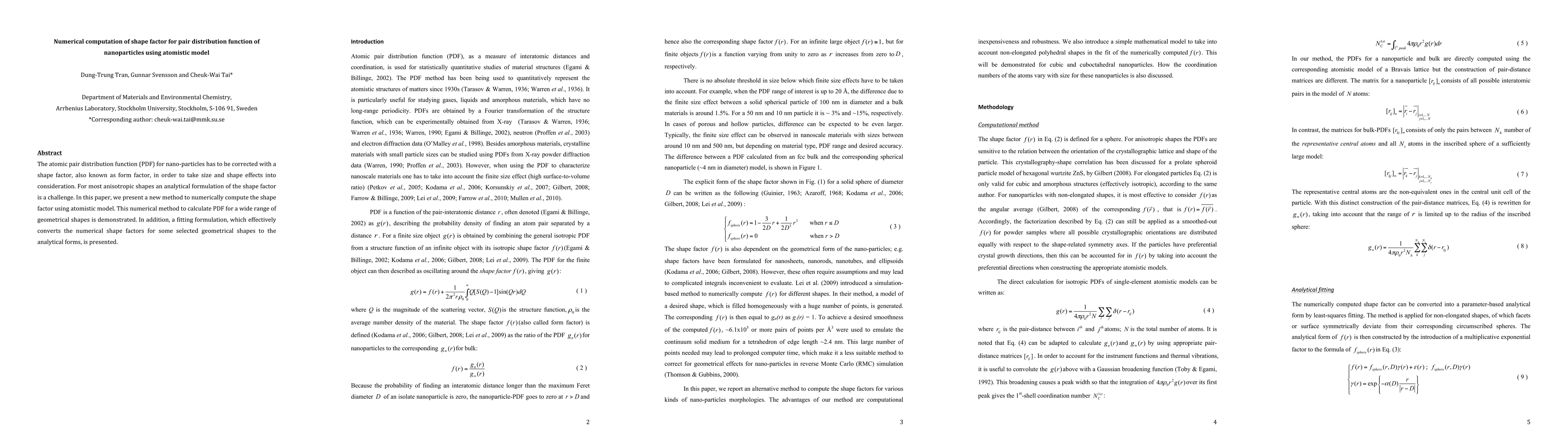 This paper introduces a novel numerical method for computing the shape factor of the atomic pair distribution function for nanoparticles using atomistic models, addressing the challenge of analytical formulations for anisotropic shapes. Additionally, it presents a fitting formulation to convert numerical shape factors into analytical forms for selected geometrical shapes.