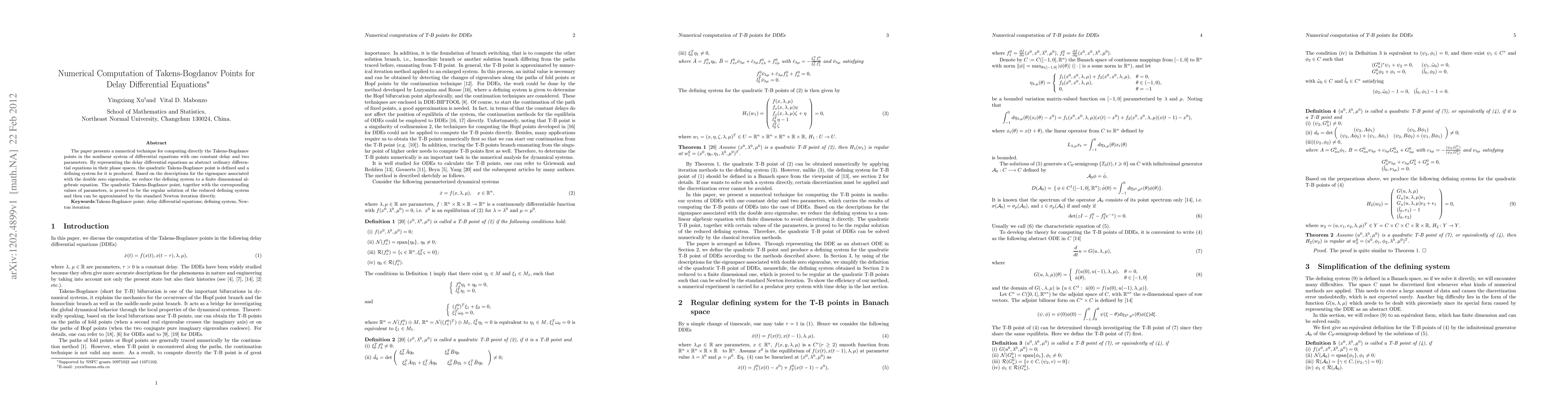 The paper introduces a numerical method for finding Takens-Bogdanov points in delay differential equations with a constant delay and two parameters. It reduces the defining system to a finite-dimensional algebraic equation and uses Newton iteration to approximate the quadratic Takens-Bogdanov points.